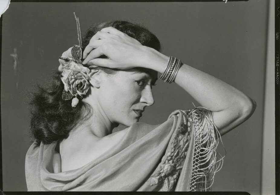 Photograph of Irene Prothroe as Beatrice in the 1958 Banff Centre production of "Much Ado About Nothing"