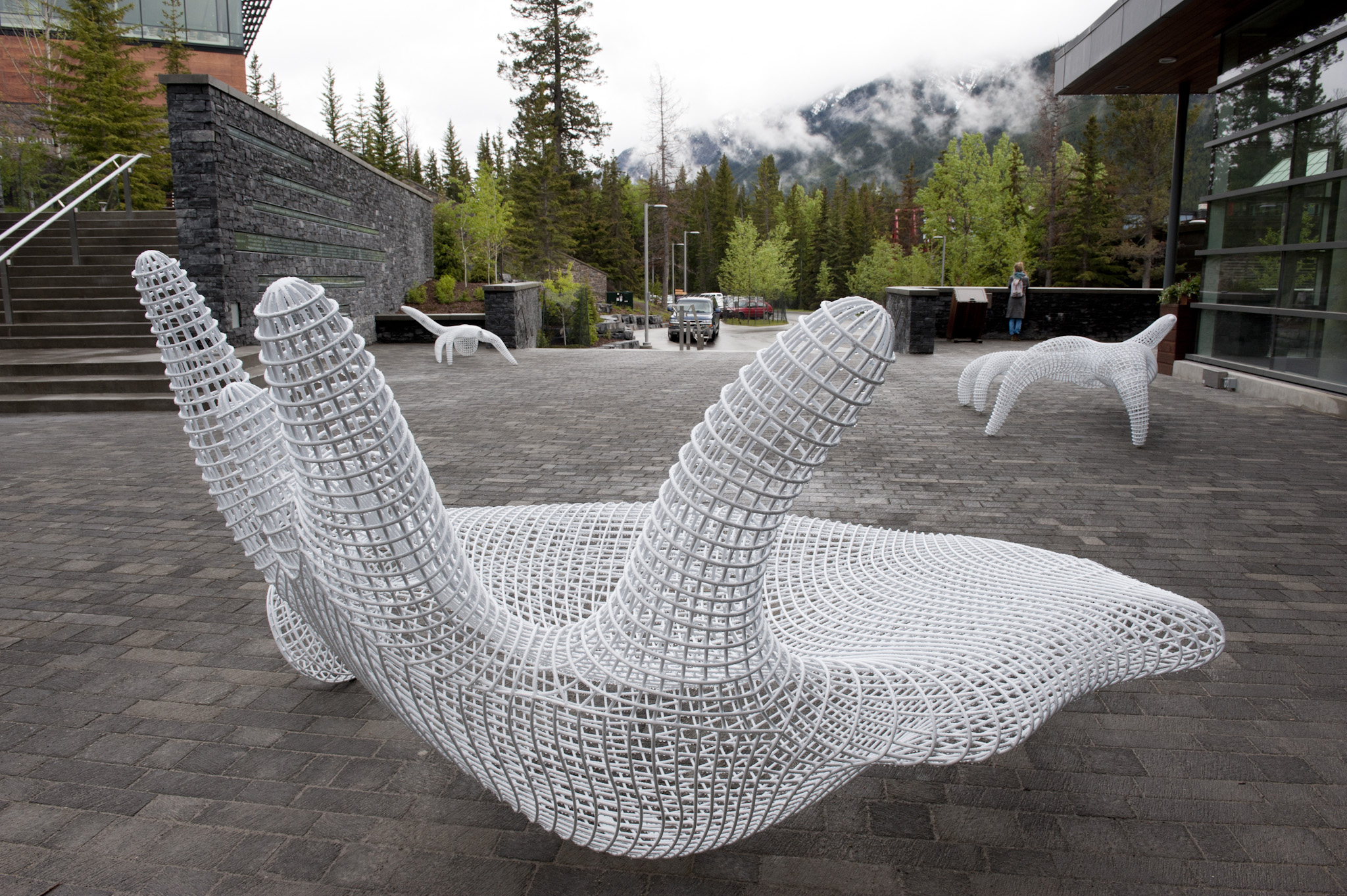 Banff, Alberta, June 7, 2011 -- In a series of three public sculptures, Vancouver-based artist and Banff Centre alumnus Brian Jungen has created a set of finely designed works that reference both the natural world, and the modernist furniture of Harry Bertoia. The ghosts on top of my head was commissioned for Canada Plaza, in front of the new Kinnear Centre for Creativity and Innovation, opened last summer at The Banff Centre. Three benches made of white, powder-coated steel, they take the forms of antlers – caribou, elk, and moose.