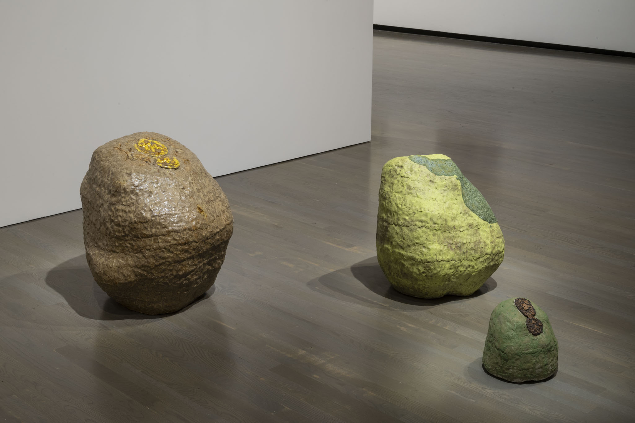 Installation view of Elliptical Lineages, Walter Phillips Gallery, Banff Centre for Arts and Creativity, 2025. From left to right: Gailan Ngan, Shore Pine Ash Rush, 2025; Chrome Spill, 2025; and Lichen Dots, 2025, all courtesy of the artist. Photo: Rita Taylor.