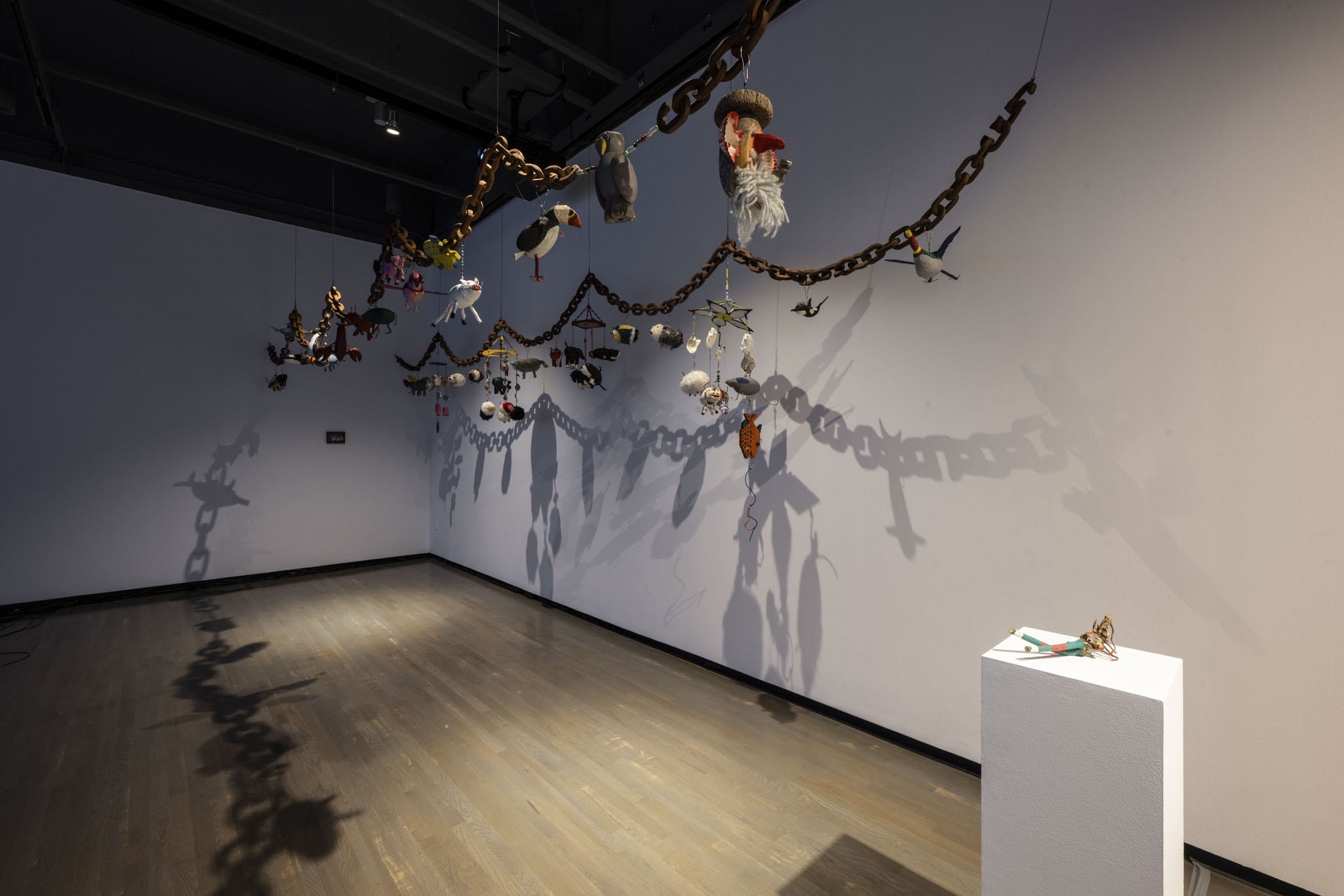 I'm showing a piece called Wave over Wave. It was originally built and presented in 2000. And then this year, I just rebuilt it, and we presented it in this show and…we brought it in to show with my father's beautiful carvings. He started carving late in life, and he had been a fisherman so he started using buoys from nets and carving figures, and he carved these beautiful chains. So we've hung two of his chains and all these incredible animals and inventive creatures that he produced. And it was so exciting to be in that room with Wave over Wave and his carvings. What a treat and what an honour it is to show with him.