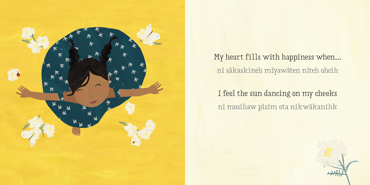 Spread from Monique Gray Smith's My Heart Fills With Happiness, artwork by Julie Flett provided with permission from Orca Book Publishers.