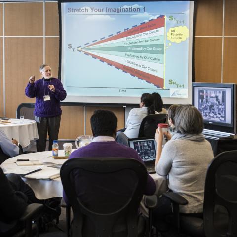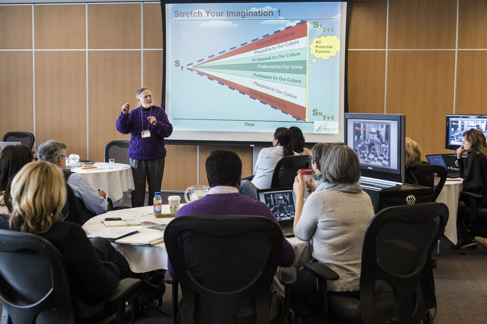 Future Framework participants worked in self-directed teams in their own working spaces then shared their work back out with each other in larger end-of-day gatherings. Each participant also enlisted an external colleague to act as a sounding board and an additional idea generator – someone with whom the participant has trust and whose opinion is respected.