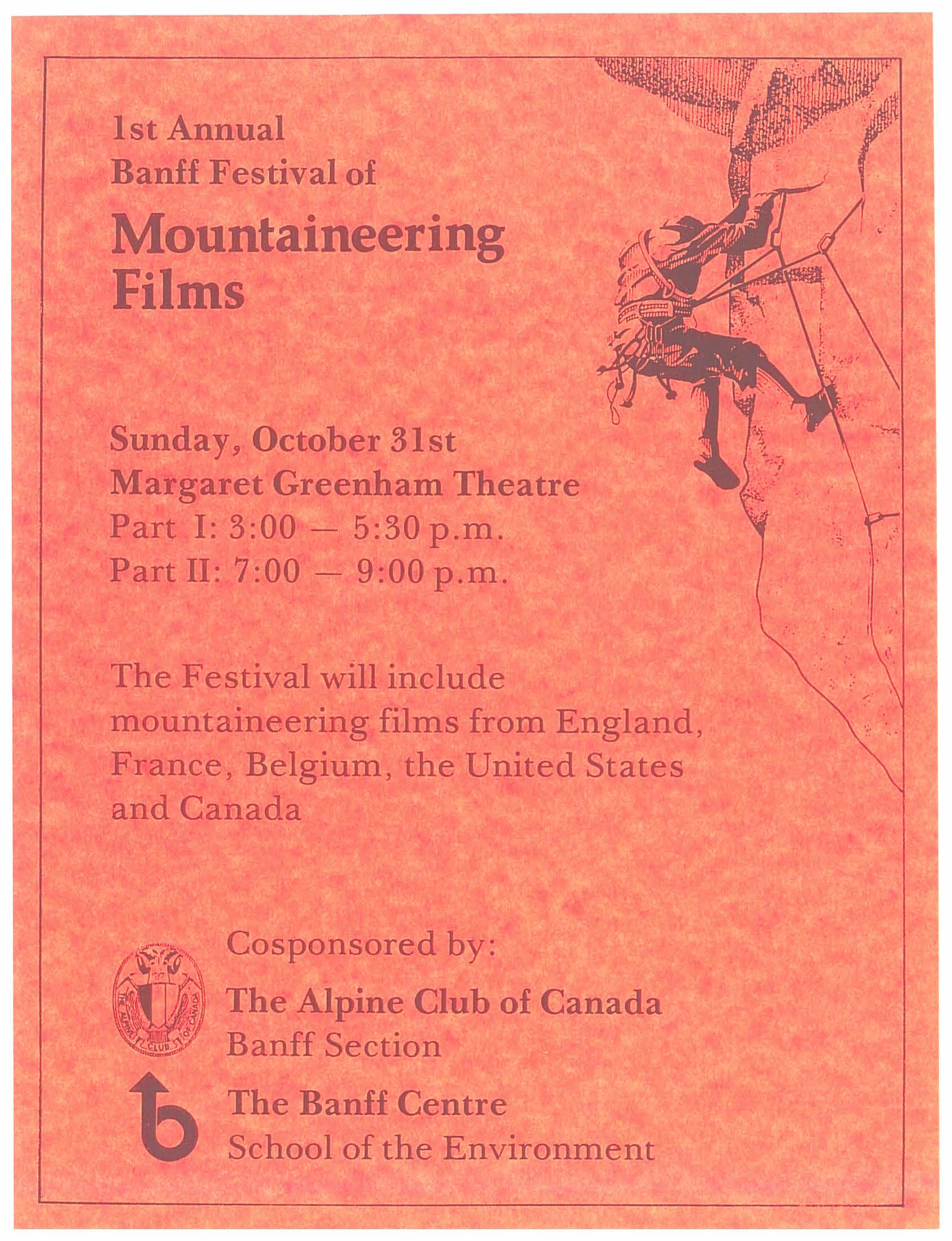 That first year, our goals were to gather together on an annual basis the best mountain and mountaineering films and to record the sources of such films, so that others might be able to acquire them for later use. Our intent, then as now, was primarily to create an event for the enjoyment of outdoor enthusiasts, but also to provide a platform for adventure filmmakers to showcase their work to the world. At the time, I was heading up the fledgling School of the Environment at Banff Centre – which subsequently was to become part of Banff Centre for Management – and was in the ideal position to undertake the organization of the 1st Annual Banff Festival of Mountaineering Films, which took place on Sunday, October 31, 1976.