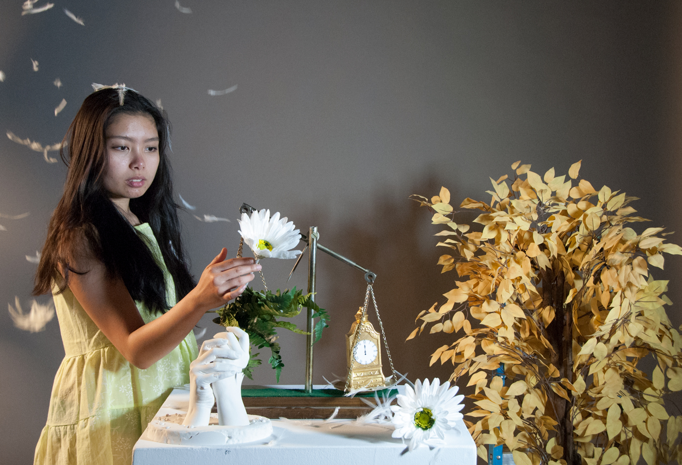 Building on the same theme, the students’ next assignment was to create a contemporary still life that considers the symbolic identity of their experience of Banff. In response, Dela Cuesta photographed a scale representing the transition from childhood to adulthood with time on one side and nature on the other. She included herself in the photo wearing a green dress surrounded by floating feathers, meant to “represent the subconscious.”