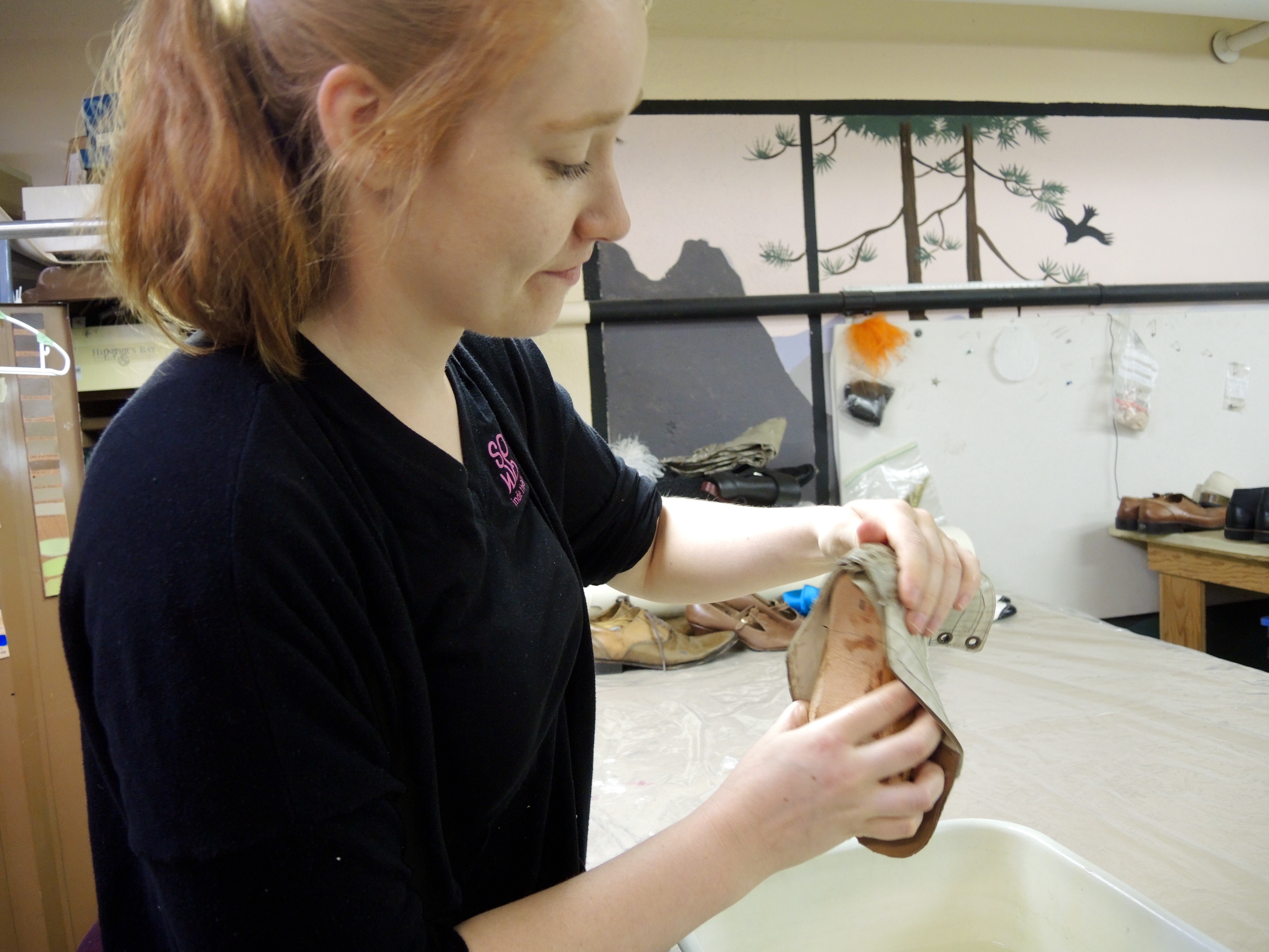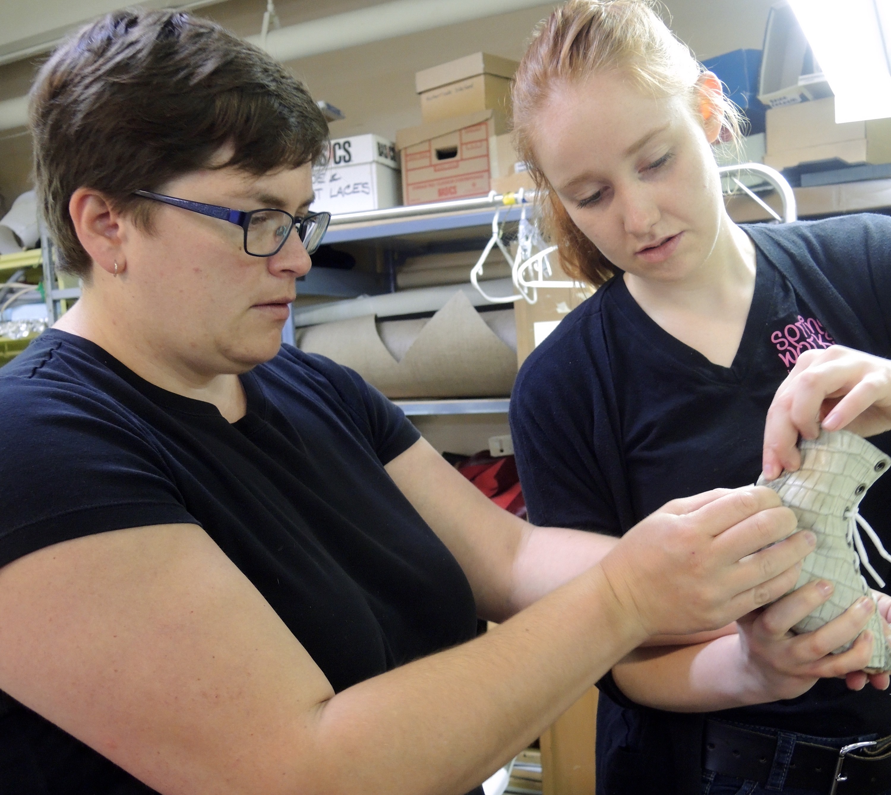 “This is the most dangerous part of the job,” Karen grins at me across the table, wielding an unforgiving bit of metal. “You learn to keep your fingers out of the way real quick.” Next to her, Bronwyn nods gravely, and I don’t doubt it. The prospect of bashing my thumbs with the lasting pincers (which look like a set of pliers that have been cross-bred with a hammer) is enough to keep me quite happy with my desk job.