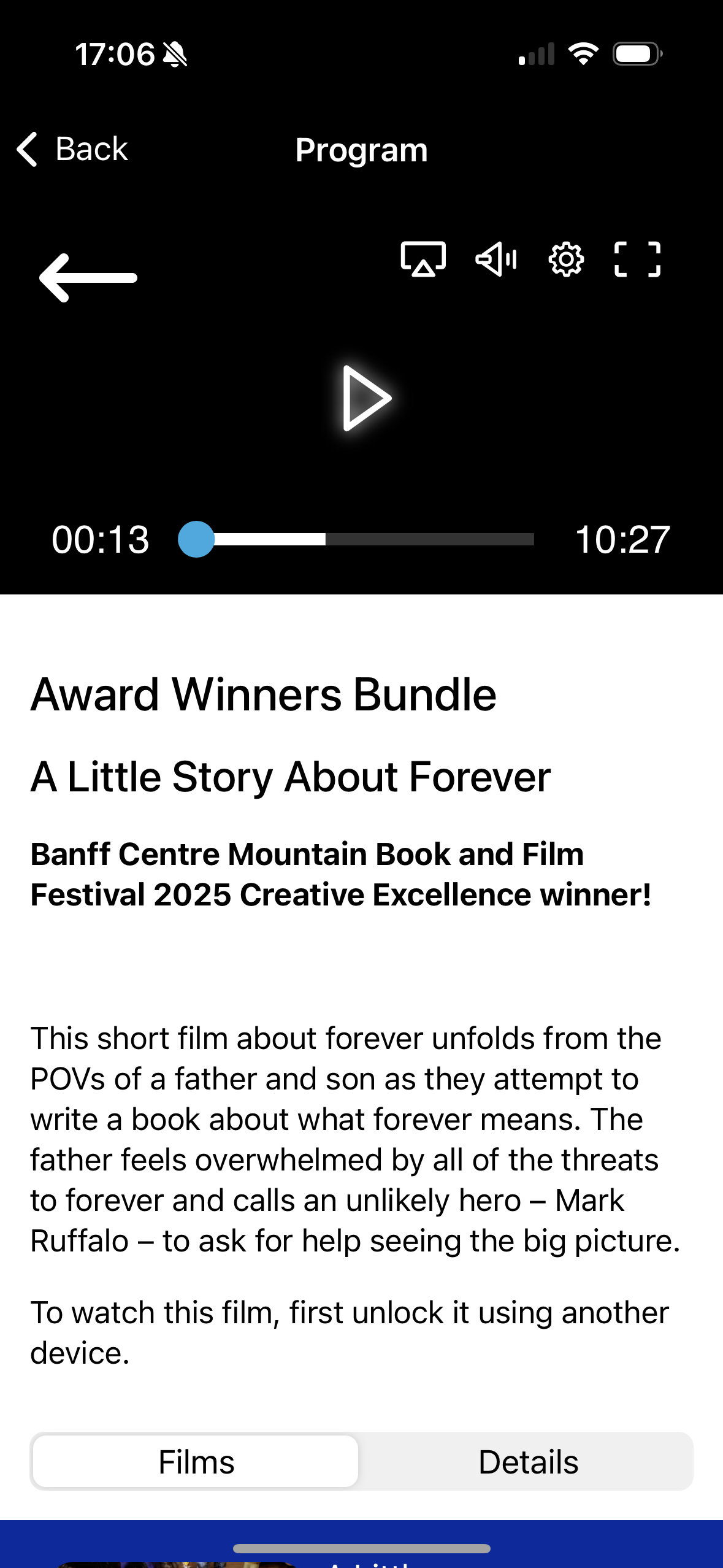 The Banff Mountain Festival App works for both Banff On Demand, and the Festival Online Films.