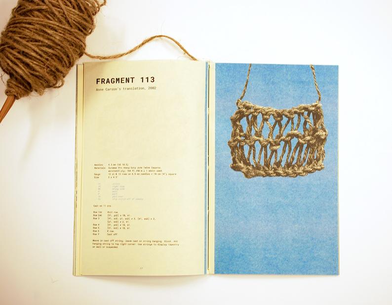 Jessica Bebenek's k2tog invites us to visualize and feel poetry in a way we never have before. The book comprises a collection of poems, each translated into a knitting pattern, as well as two knitting needles and a ball of twine, inviting the reader to create a unique, one-of-a-kind knitted poem all their own.