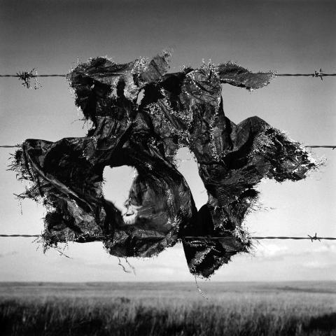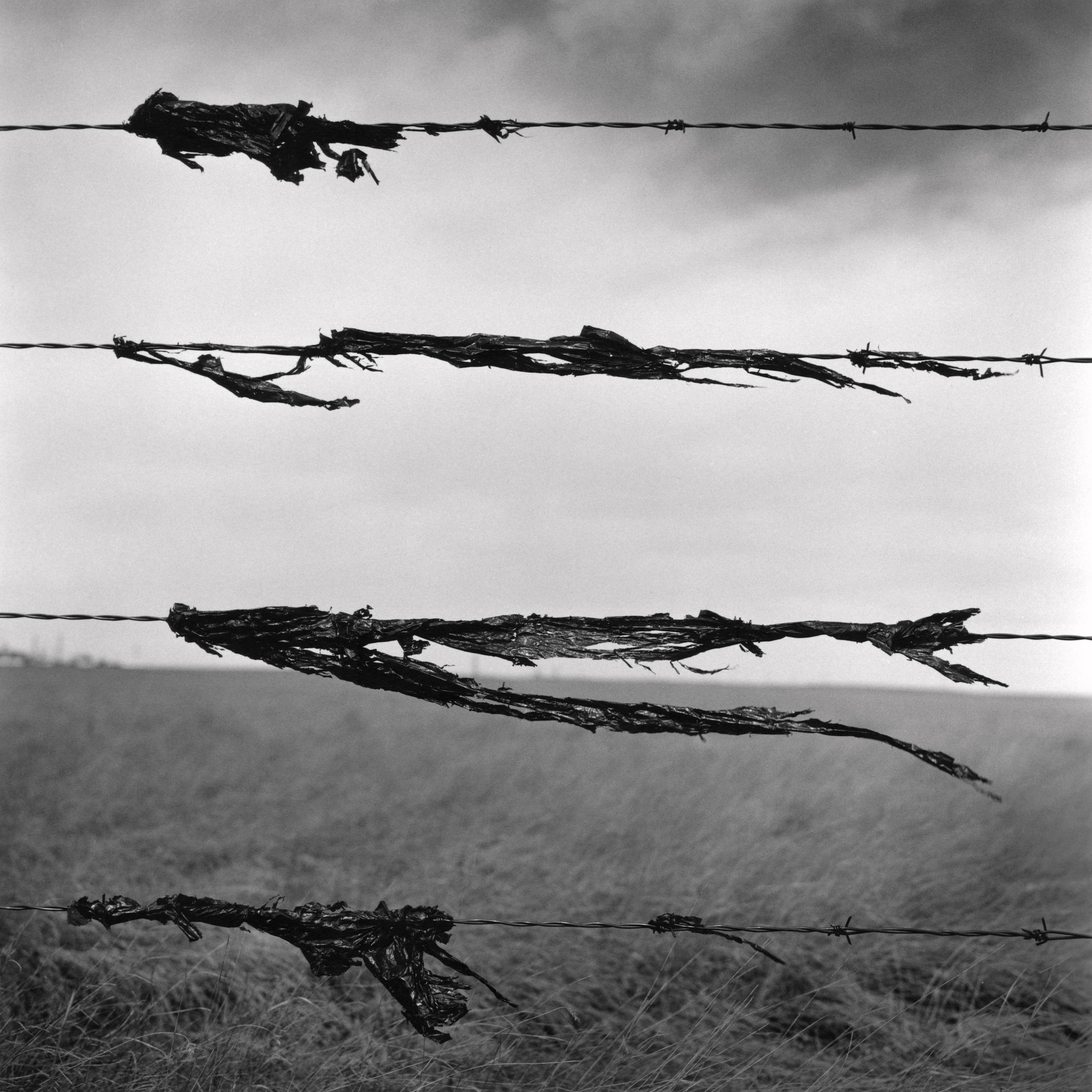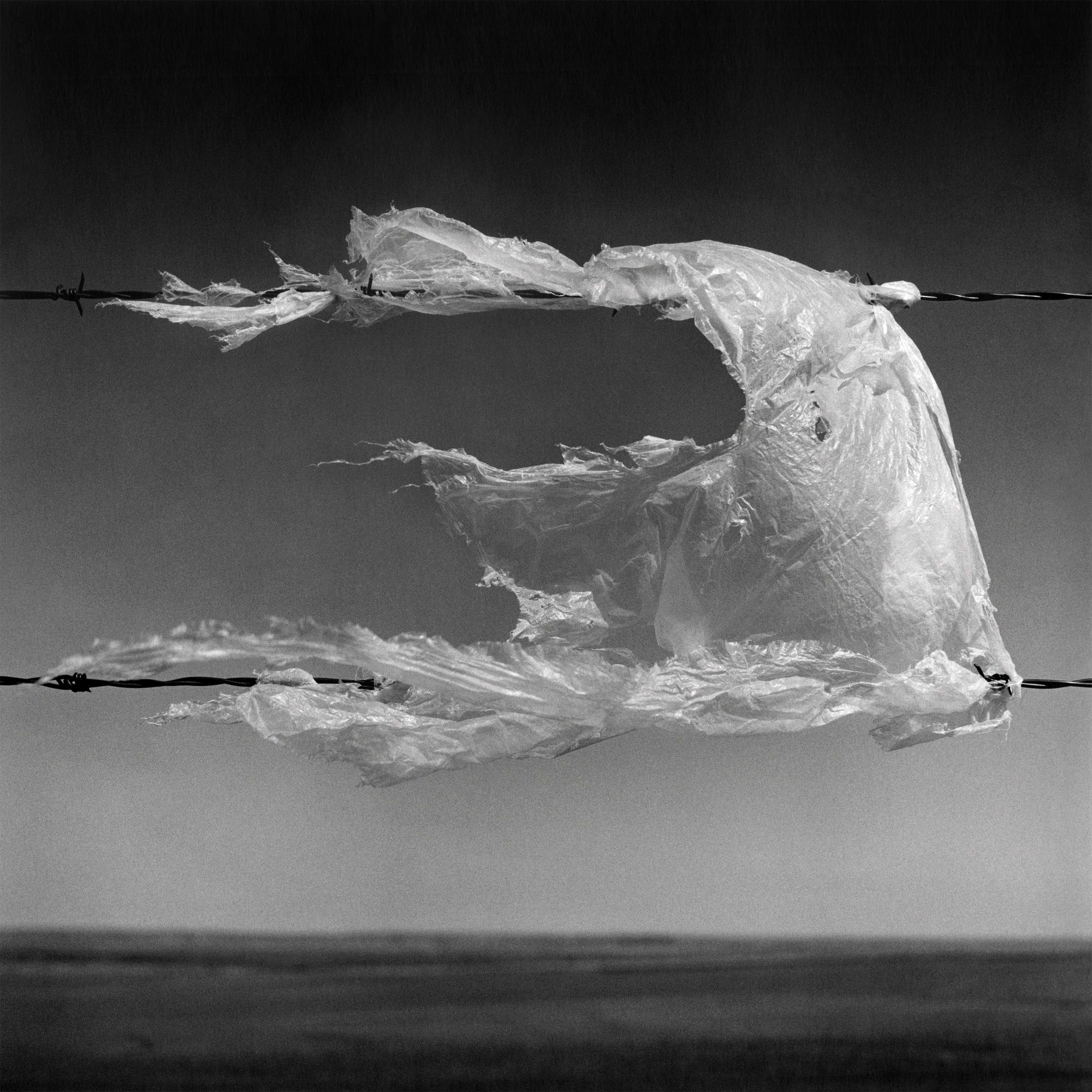 The series of photographs include black and white images of tattered plastic caught in barbed-wired fences that line the prairies of southern Alberta. Bell’s images are powerful and transport me to my childhood where my parents would fly kites with me in the same open fields and blue skies of southern Alberta. Things are different now. I am no longer swaying carefree in the wind like a kite but am caught like a piece of plastic on a fence in a complex and delicate snare of memories of a time passed and the fear of what will come. Bell’s collection explores similar poignant themes such as the fear of the unknown, vulnerability, grief, and loss, evoking a powerful relationship between place and human experience.