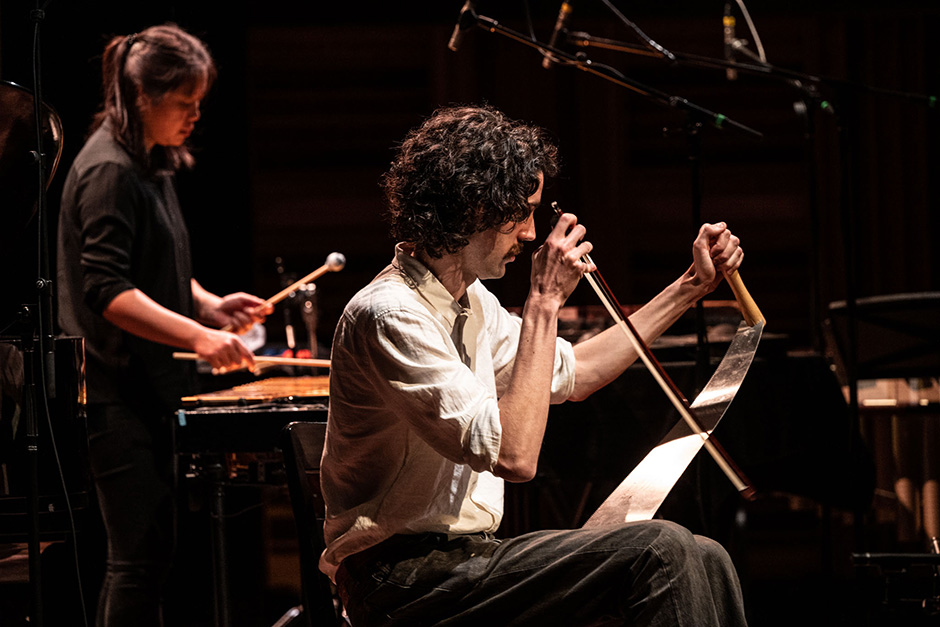 Hoi Tong Keung, percussion; Ollie Hawker, musical saw. Photo by Rita Taylor, Banff Centre 2022.