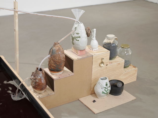 Candice Lin, 'System for a Stain,' 2016. Wood, glass jars, cochineal, poppy seeds, metal castings, water, tea, sugar, copper still, hot plate, ceramic vessels, mortar and pestle, Thames mud, jar, microbial mud battery, vinyl floor. Dimensions variable. Commissioned by Gasworks. Courtesy the artist and François Ghebaly, Los Angeles. Photo by Andy Keate.