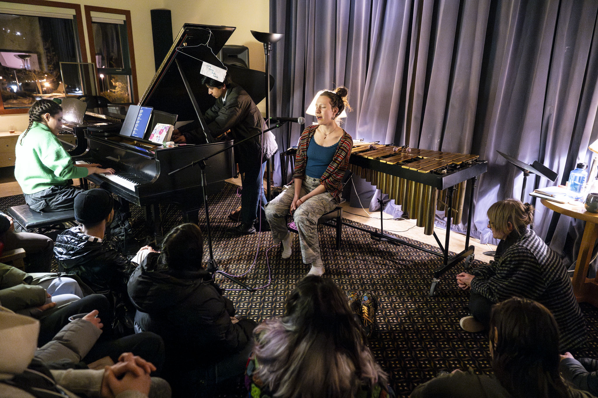 Maddalena Ohrbach from À Mer (voice), Elissa Nakhleh from À Mer (piano), and Aditya Bhat (percussion), BMiR 2025 Open Studio, photo by Rita Taylor.