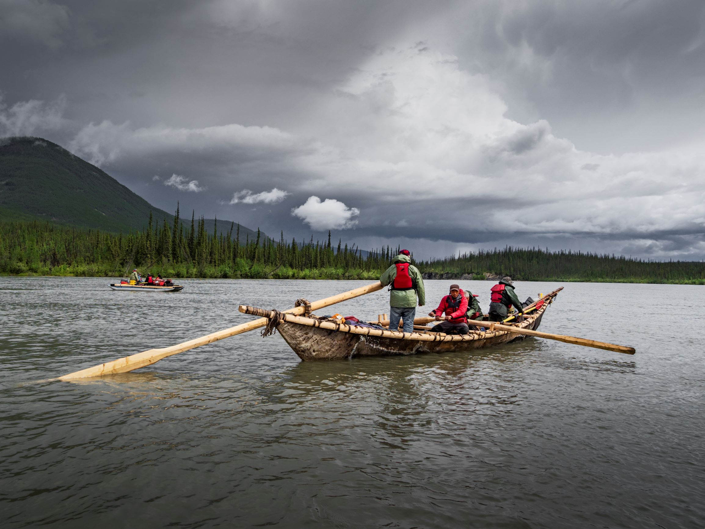 The Dene are Indigenous people in Canada’s Northwest Territories. Dehcho Dene spent the winters hunting and trapping in the mountains along the South Nahanni River. In the spring they would build a great moose-skin boat. When the ice broke, the families with all their belongings and their harvest of dried meat and furs would set off down the magnificent Nahanni River. A moose-skin boat hasn’t been seen on the Nahanni in one hundred years! Now Dene want to re-awaken this tradition, to reconnect with the spirit – the spirit of their ancestors, the spirit of their land, and of their culture. It is a sacred, healing journey to reclaim whatever has been lost.