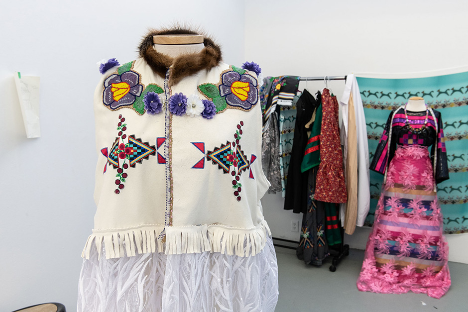Livia Manywounds, artist. Banff Centre 2022 Indigenous Haute Couture Residency. Photo by Rita Taylor.