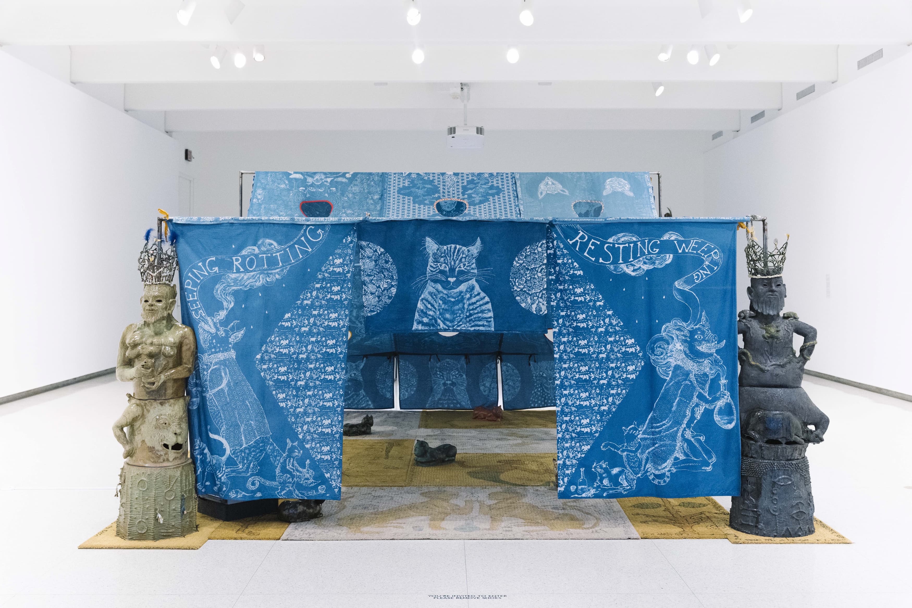 Candice Lin, "Seeping, Rotting, Resting, Weeping" 2021. Hand-printed (katazome) and hand-drawn (tsutsugaki) indigo panels, steel bar, dyed rugs, glazed ceramics, epoxy resin, feathers, block-printed and digitally printed fabric (masks), bells, tassels, and miscellaneous small objects, dimensions adaptable.