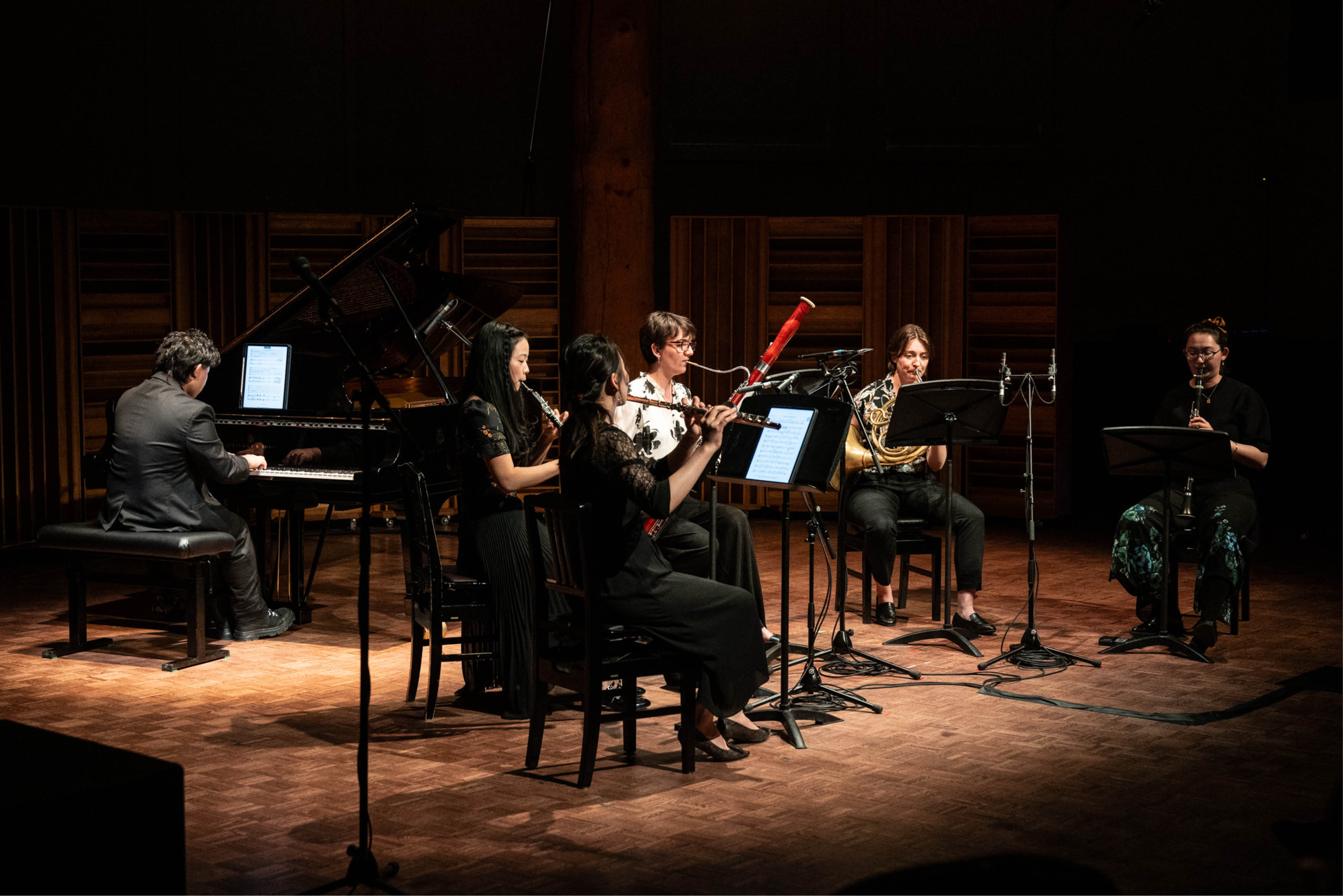 Aidan Chan (piano), Kai Chen Cheng (flute), Emily Luo (oboe), Nikki Pet (clarinet), Ellie Shifflet (bassoon), Madeleine Davis (horn). Banff Centre 2024. Photo by Rita Taylor.