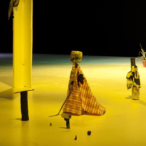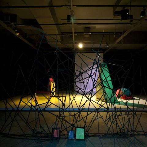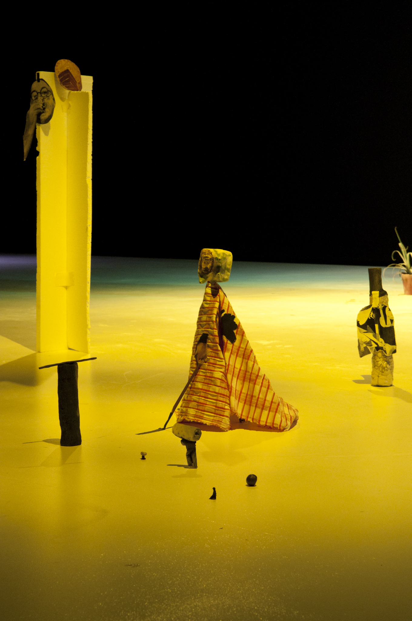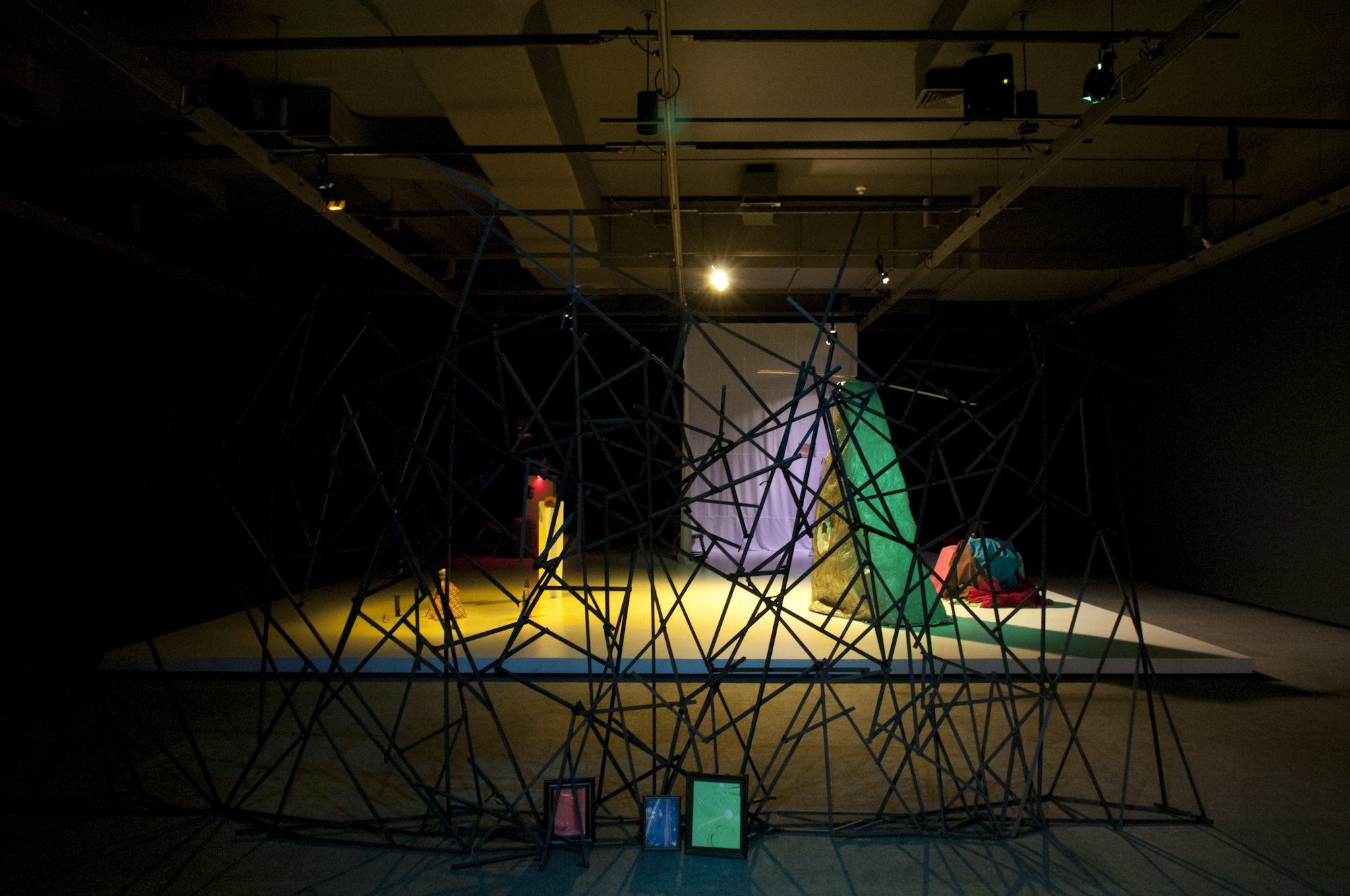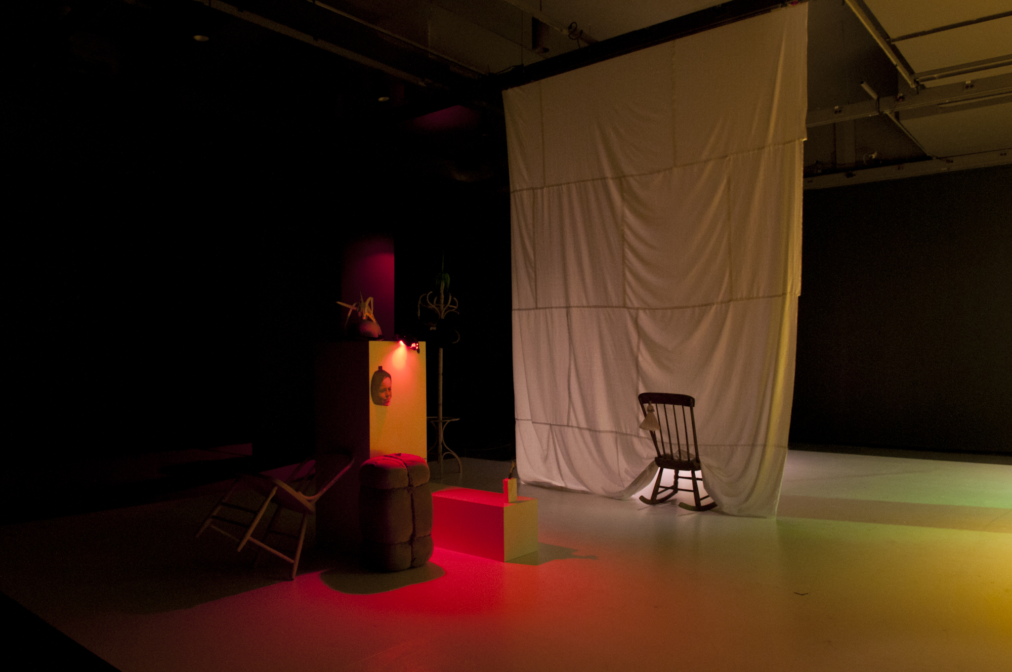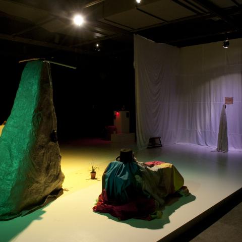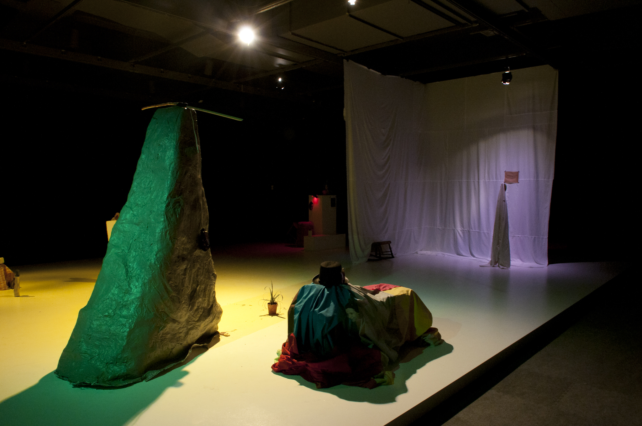 God’s Dice was a “sculpture play” presented by Geoffrey Farmer in association with Theatre of Erosion or I Hate Work That Is Not A Play, a four-week thematic residency that he lead at Banff Centre in 2010. Continuing his interest in time and place, and in art that makes process visible, Farmer created new work with participants in residence. Incorporating props from the Theatre Department, such as mirrors, musical instruments, sculptures, texts and costumes, this conceptual work makes use of chance operations, improvisational methods, and choreographed actions. It is the sum of all these parts that creates a singular narrative, a final story that can only be fully realized at the moment the end is announced.