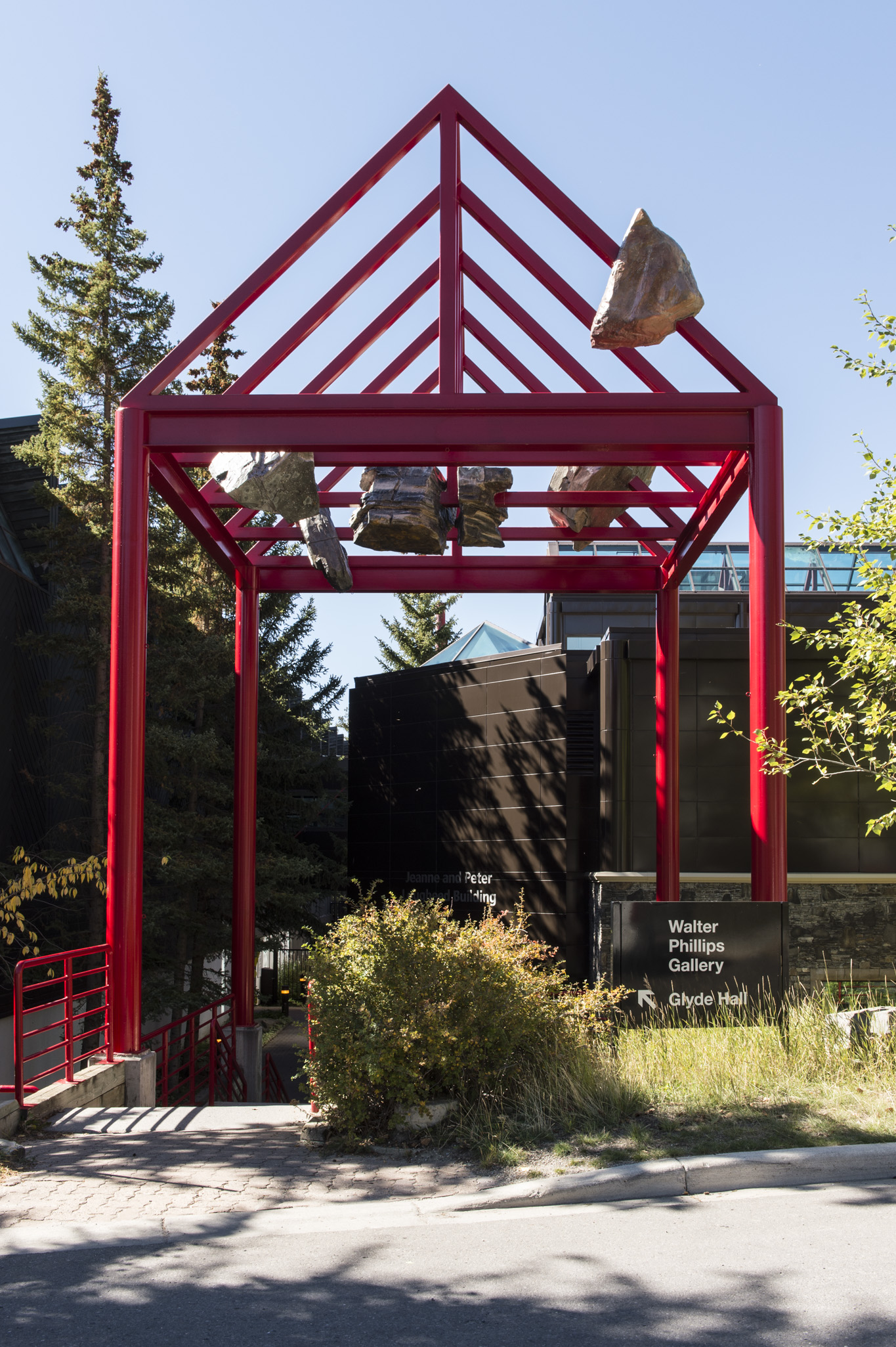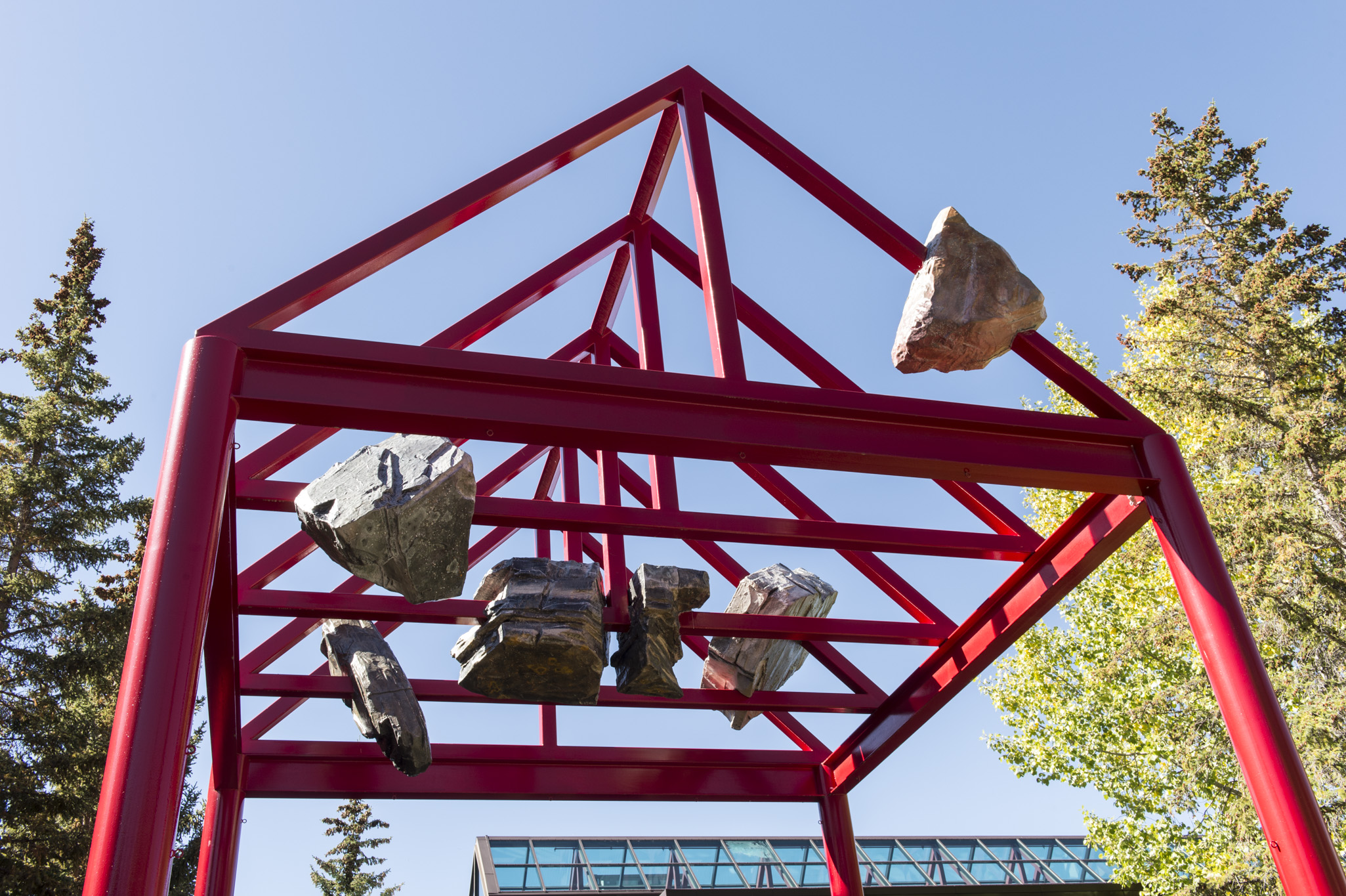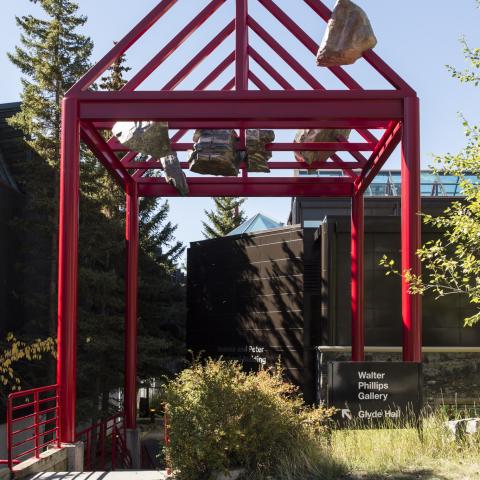 held above our heads in stone is the first in a series of public art commissions by emerging artists for Walter Phillips Gallery. Here, Calgary-based Tyler Los-Jones suspends belief and inverts gravity with objects that resemble the strata and rock formations found near Banff Centre such as limestone, chert, and sandstone. The objects poised in the rafters of the entrance archway refer to a pre-human time (approximately 359-299 million years ago) when the mountains surrounding Banff were once the seafloor. The interplay of geologic time and the act of looking, shifts the perception of these objects; objects that mimic, at times flawlessly, the real rocks that scatter the town site and forest.