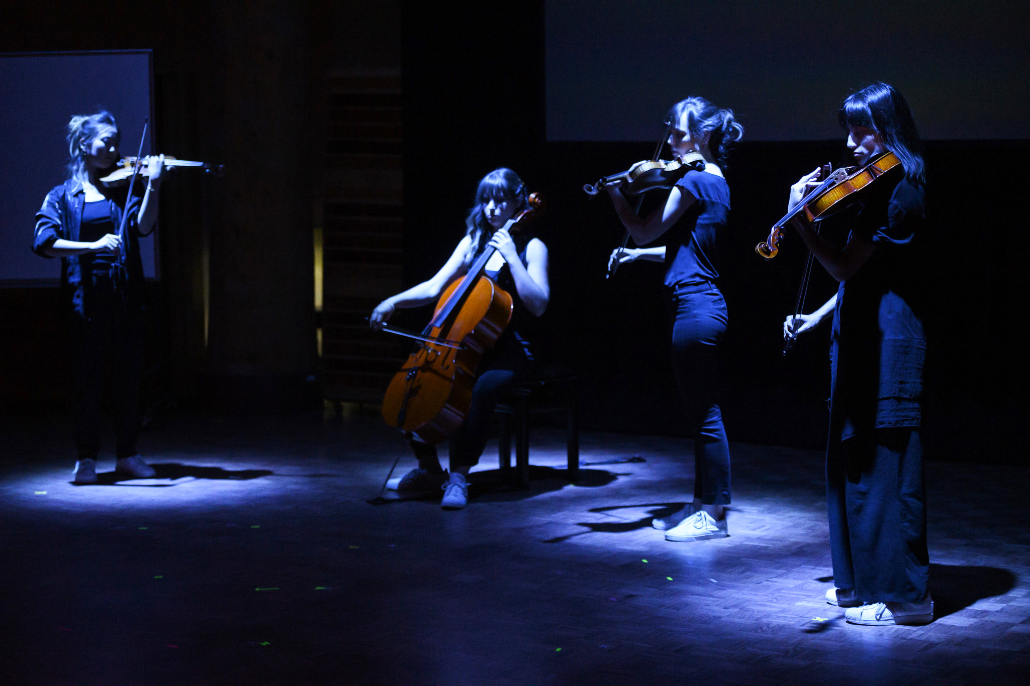 Quartet 121 Molly Germer, violin I (U.S.A.), Thea Mesirow, cello (U.S.A.), Julia Un Suh, violin II (U.S.A.), Lena Vidulich, viola (U.S.A.). Photo by Donald Lee.