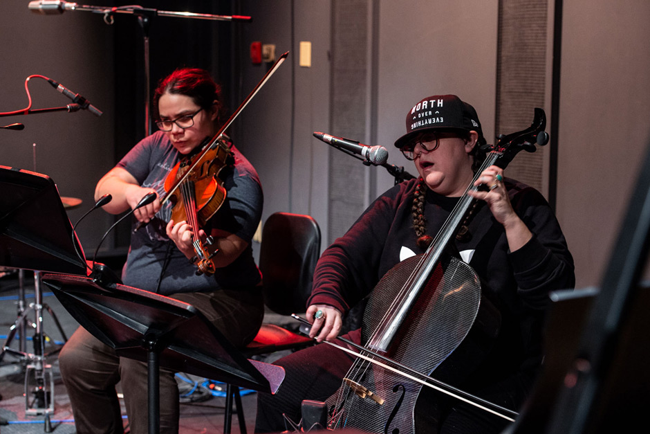 Melody McKiver, violist / percussionist / composer;  Cris Derksen, composer / cellist during first iteration of Canadian Indigenous Classical Music Gathering, 2019. Photo by Jessica Wittman.