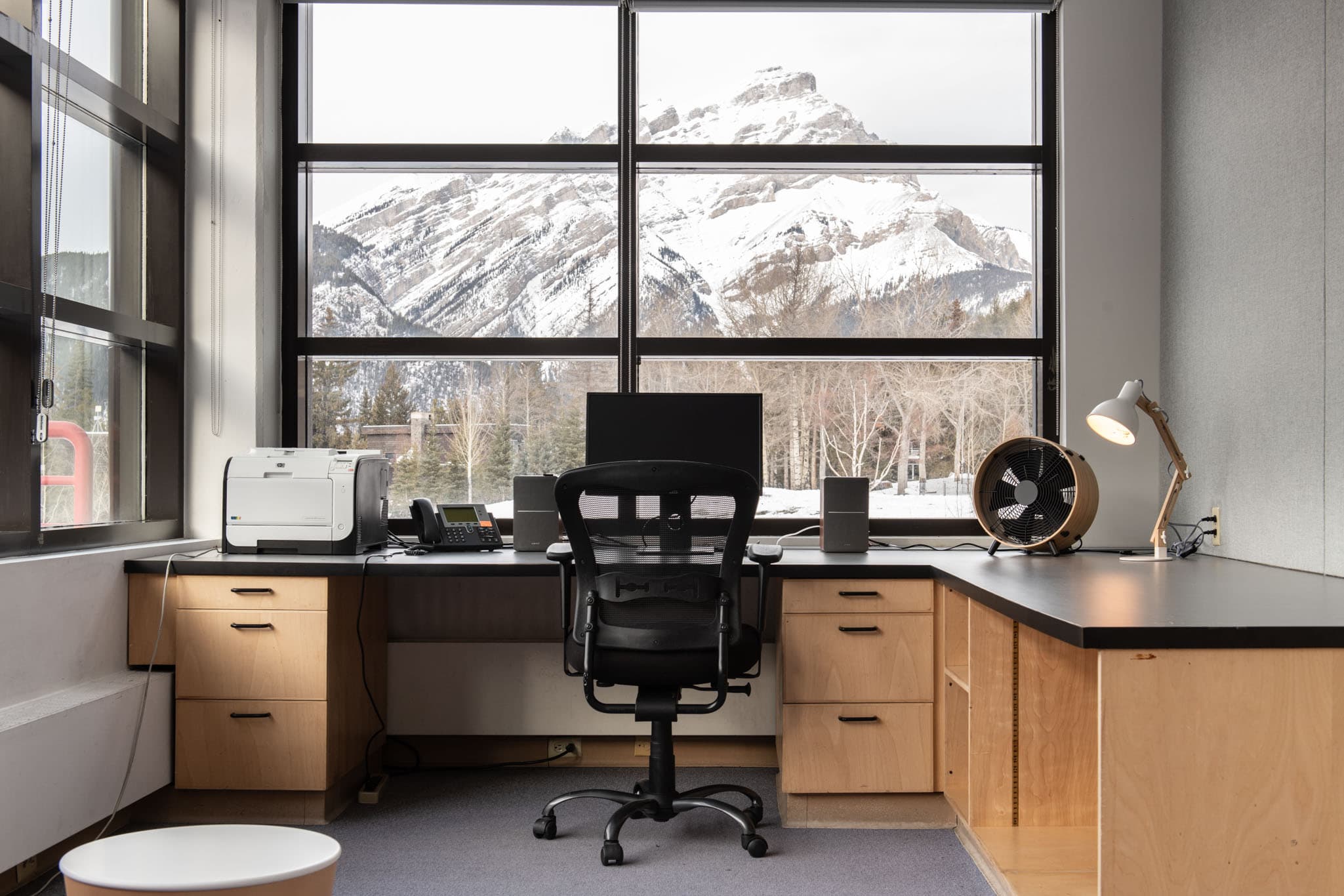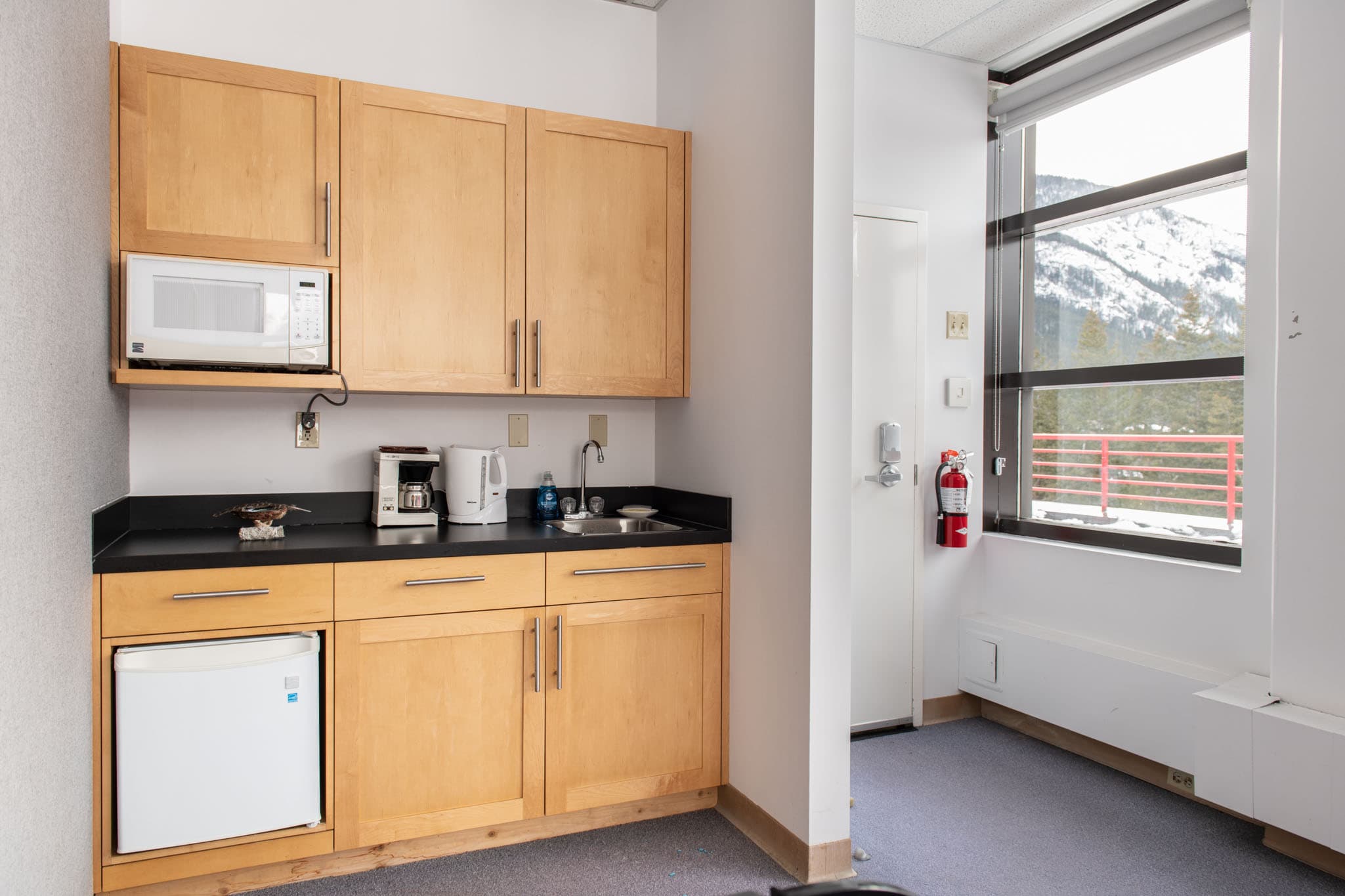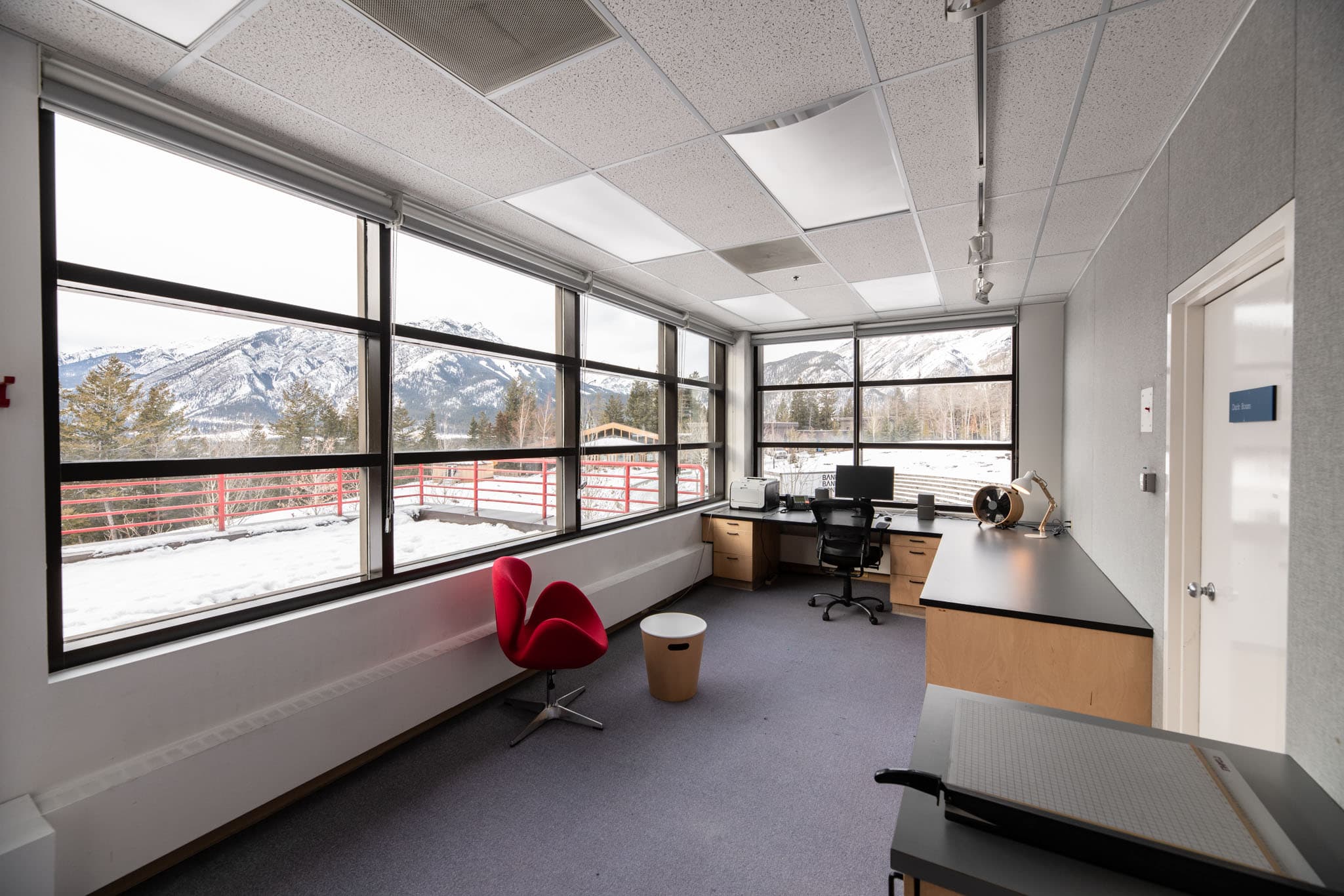 This comfortable studio with ample desk space and black-out blinds for video or digital projects. It offers stunning views of the Bourgeau Mountains and is adjacent to a long rooftop patio.
