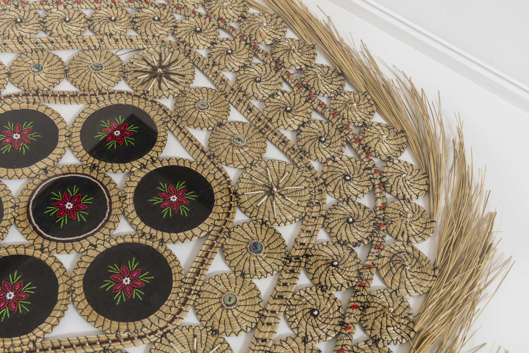 Rebecca Baird, Detail of "MEMORY CLAIM #1" (1995). Sweet grass, hide, porcupine quills, seed beads and abalone buttons, 78.7 cm diameter. Collection of Walter Phillips Gallery, Banff Centre.