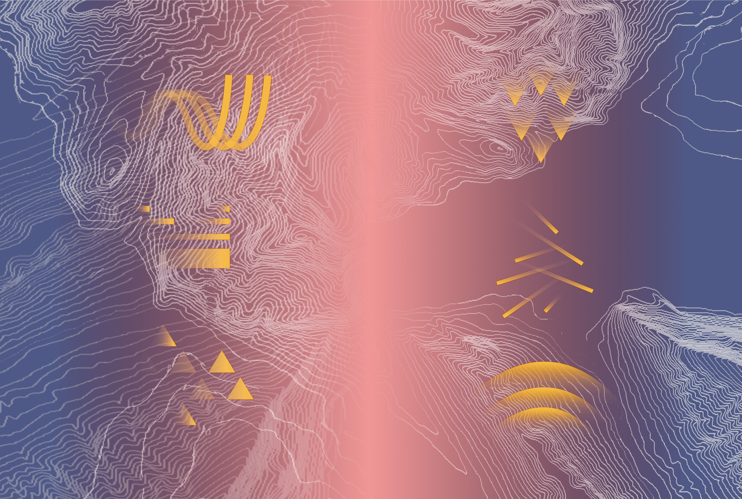 The sonic impact of human technologies on non-human creatures, such as when the sound of a plane disrupts the ability for frogs to hear one another, causing their calls to fall out of synch and leaving them more vulnerable to predation, informed the audio work and is referenced in the score. Concurrent vocalization at different moments throughout the piece imply the political nature of collective sounding during queer times of day, and ideas of concealment, refuge or strength within and through a chorus. Other images in the score point to sounds that one is invited to imagine. Three curving lines reference the idea of the geophony, described in the score as “sounds made by the earth and atmosphere,” and the seismic waves that would have formed the mountains. The risograph print also includes imagery of topographical maps of Sulphur and Rundle Mountains, and of the Banff townsite that are manipulated and layered, locating the work within this specific geographic context as well as recalling the resonant lines indicative of sound or reverberation. Whether encountering Dawn Chorus, Evensong (Bow River Valley) as an audio work or through the printed risograph, Sheppard invites us to consider how we might be with others who take both human and nonhuman forms. To quote the score: