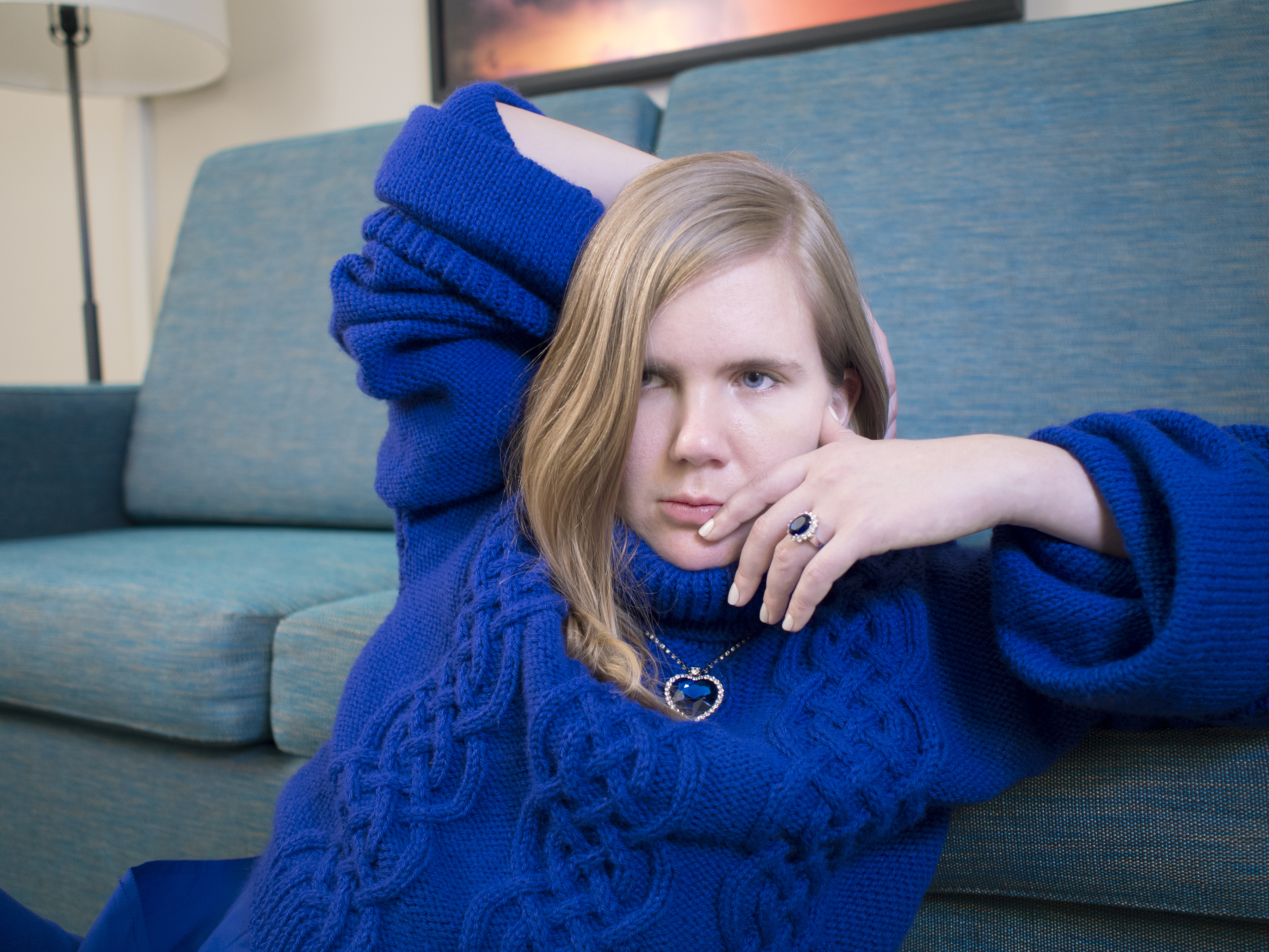 Amid the sterile and ubiquitous neutral tones of a generic hotel room, we see artist Bridget Moser splayed on the floor, dressed entirely in cobalt blue. She cycles through a series of activities alone in the hotel room: the bluish glow of a lightbox illuminates her face as she contemplates the lively snowboarders it depicts; she slowly crawls out from under the covers, lying on the floor as though defeated; she gazes absently at Toronto’s CN tower, as (in stroke of poignant timing) it turns blue; and pulling out the hideaway bed is an unprecedented struggle. Throughout, her impassive eyes ask: tell me, how should I feel?