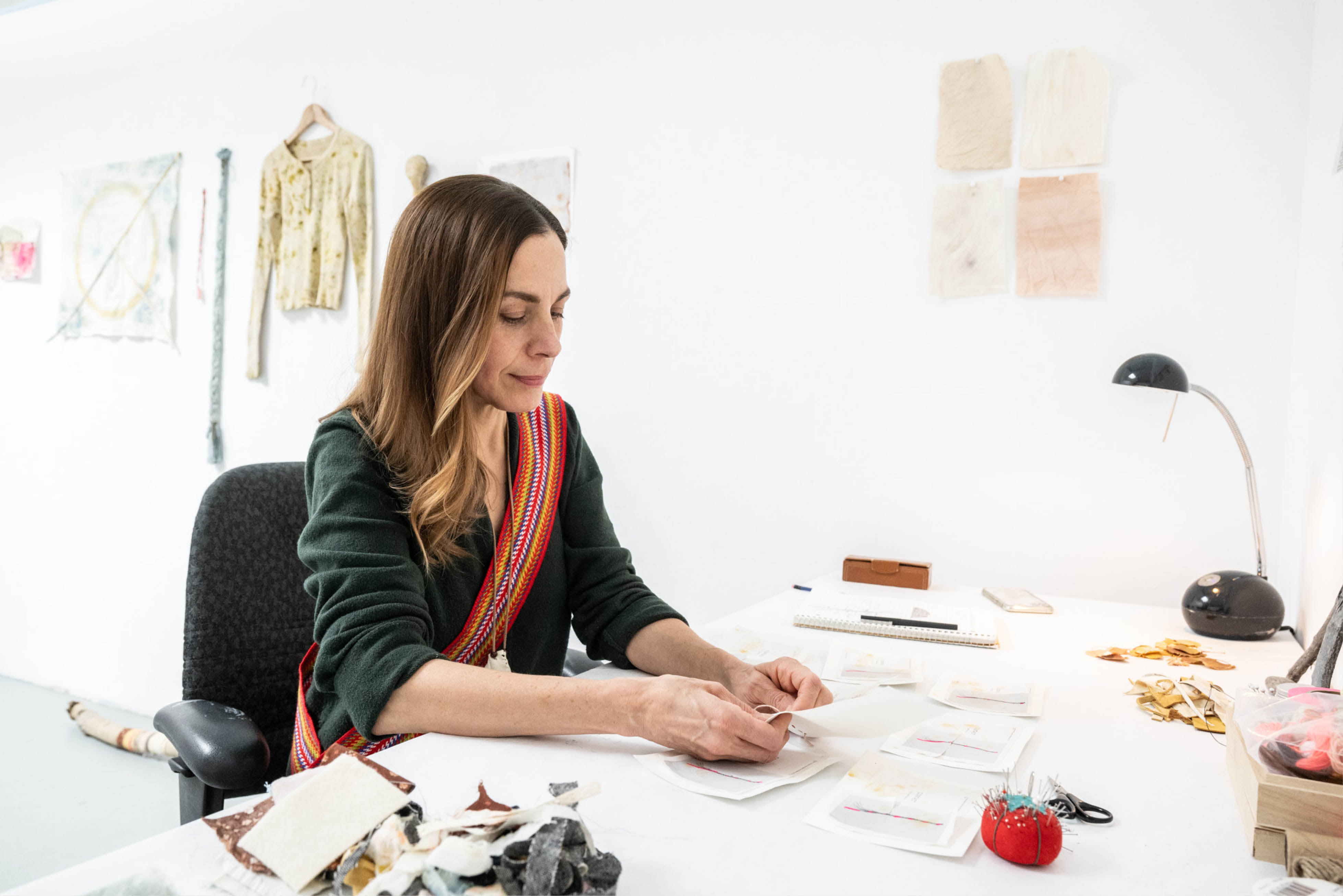 An artist is working at a table in a studio