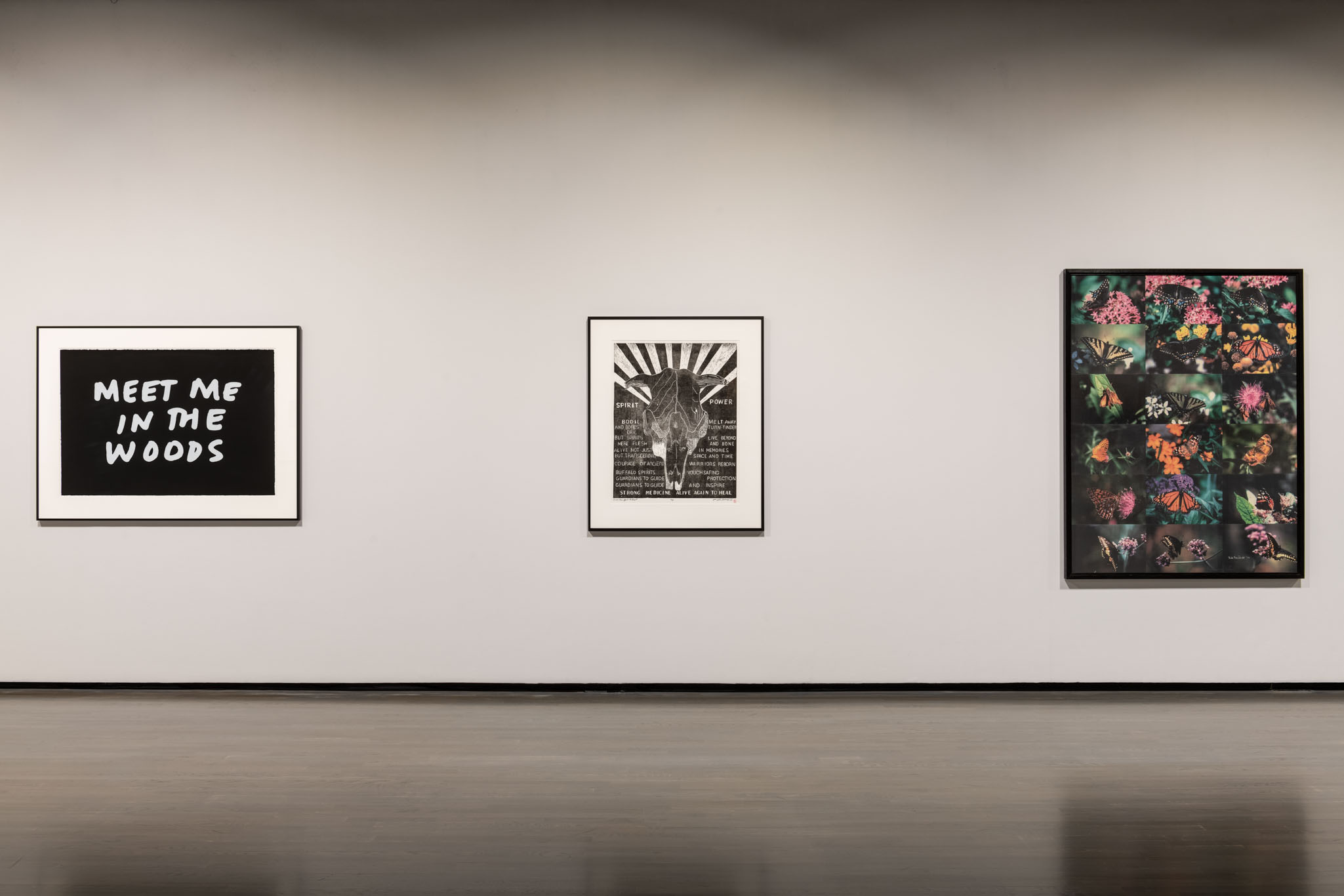 Other works were selected for their relationship to the public art collection situated across Banff Centre's campus, echoing the outdoor works within the exhibition. Tipping Point (2010) by Brian Jungen was produced in relation to the artist's public sculptures, The ghosts on top of my head (2010-11) and speaks to questions of consumption within the National Park while also humorously subverting the nationalist associations of certain local wildlife such as the beaver. A pair of silkscreen prints by August Klintberg, one reading 'meet me in the woods' and the other, 'meet me in the town,' mirror the language of the public works on campus by the artist; the phrases both ambiguous and playful in terms of whom they are meant to address and the purpose of the meeting. A series of photographs that compose a part of the public artwork, Vessel/Enclosure (1996-2043) by Peter von Tiesenhausen annually document the slow degradation of a sculpture in woven willow branches through its natural exposure to the elements, and are paired with a photograph on loan of a similar sculpture on the artist's property in Alberta's Peace Country that has since returned to the earth. Eastern Butterflys '95 (1995) by Mike MacDonald depicts butterfly species from his place of birth in Nova Scotia and is included for its relation to Butterfly Garden (1999); a living artwork by the artist composed of plants selected for their ability to provide refuge for butterfly species that draws on Mi'kmaq and western scientific forms of knowledge. Human and animal relationships are also centred in Jane Ash Poitras' From New York to Banff (2019), which combines image and text referencing the significance of the buffalo in the artist's Cree worldview.