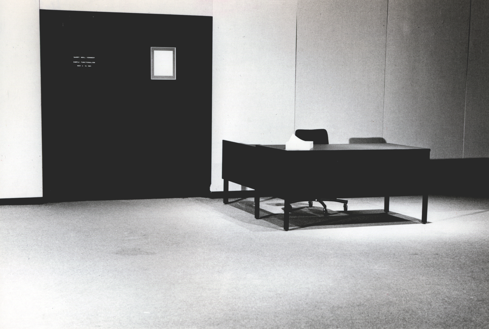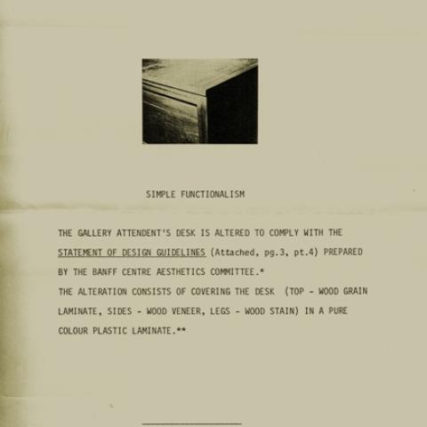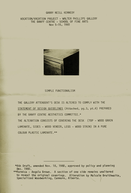 For the seminal exhibition Vocation/Vacation in 1981, Garry Neill Kennedy made a spare new installation entitled Simple Functionalism. All that remained in the space was the attendant’s desk, altered to comply with the “Statement of Design Guidelines” issued in 1980 by The Banff Centre Aesthetic Committee. Kennedy’s choice to present an institutional piece of furniture as the only object in the gallery enabled him to reveal the context in which art is produced and displayed. Some visitors were hesitant to enter the installation, doubting whether they were allowed into what appeared to be an empty gallery. Faced with only a transformed desk and its occupant, the audience was confronted with what is traditionally overlooked: the white walls, the flooring, the lighting tracks, and the space itself.