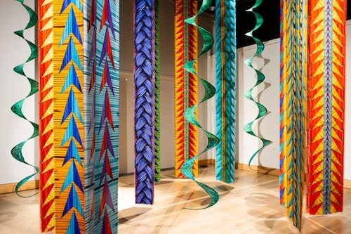 Daphne Boyer, Cedar and Sweetgrass Banners, 2022. Digital collages of individually photographed porcupine quills. Image printed on silk twill using acid dyes. 16' X 14'. Photographer: Lina Samoukova. Courtesy the artist.