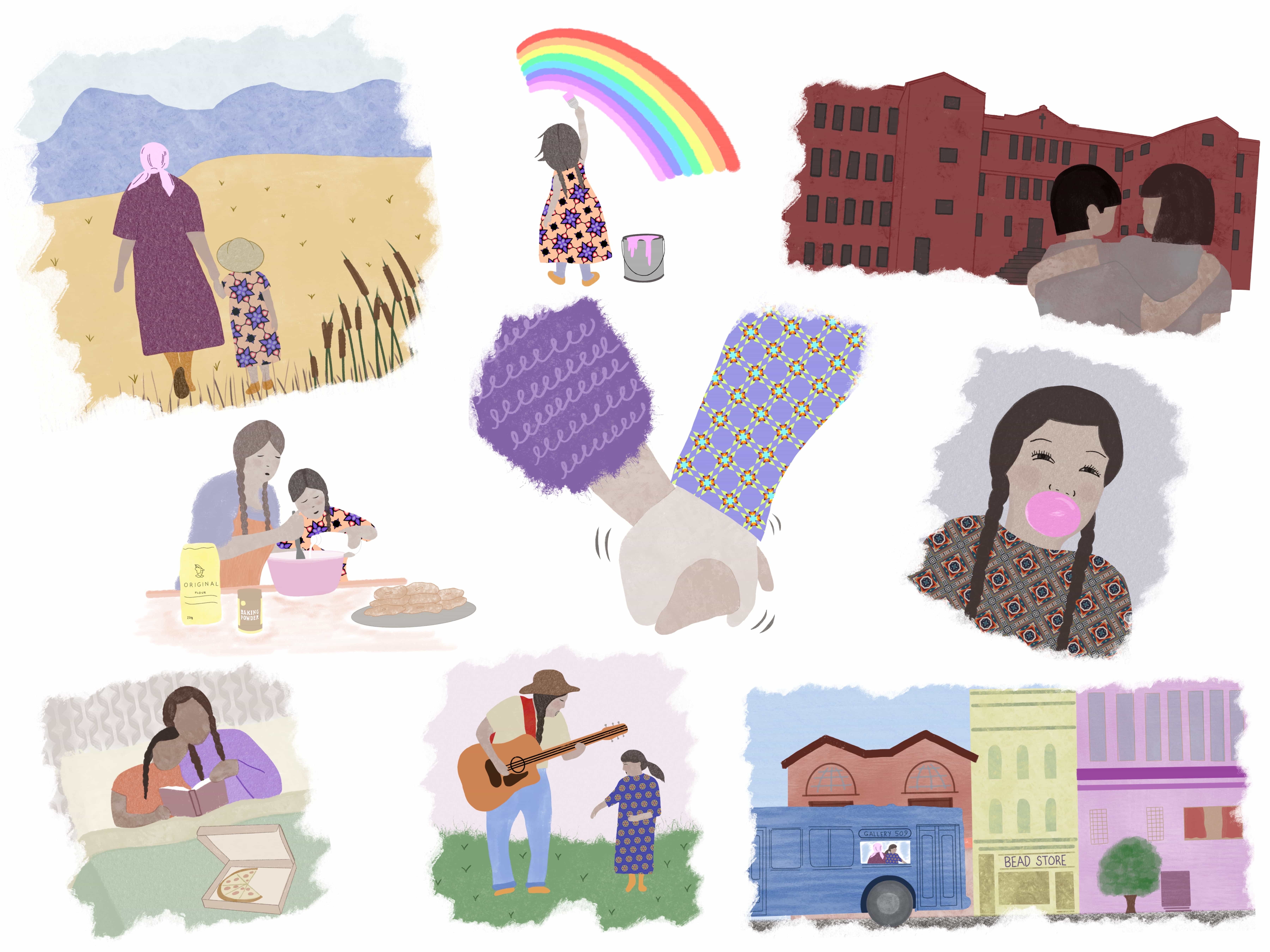 Sarah Houle is an artist and performer from Paddle Prairie Métis Settlement in Northern Alberta. Her practice is collaborative and time-based, evolving from personal mythology, familial roots, and material explorations to encompass film, animation, installation, sound and performance. A continuous thread follows her work: bold, pastel colours, beadwork motifs, and recurring characters of the Shapeshifter, Bird Boy, and Little People. Sarah makes her home in Mohkinstsis/Calgary, but family—near and far—is integral to her process, both as subjects and collaborators. She draws from ancestry and creates in community, never alone as she explores hidden worlds. Mentorship is an increasingly important part of her practice, sharing in the abundance of communal wisdom and collective work. Her roles as an artist, mother, bandmate, collaborator, and community member evidence Sarah’s belief in interconnected relationships, stretching across place and time.