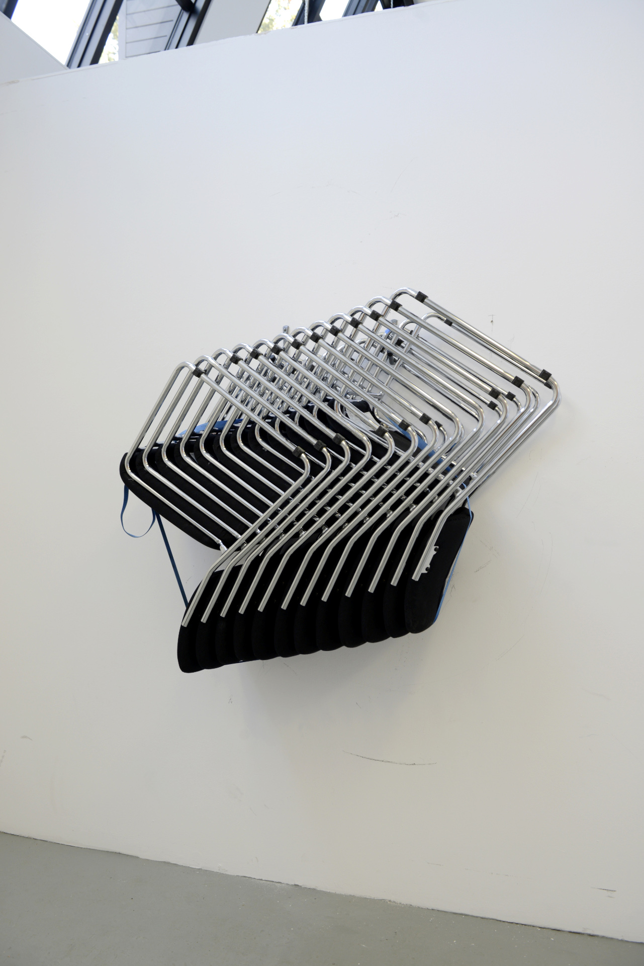 My work took a different turn at Banff Centre. I became inspired by the objects within the Visual Arts building (Glyde Hall) and on campus, which play a particular role in the social interactions of the people and staff working there. By placing these objects in the studio and in unusual positions, I am exploring the boundaries of public sculpture, ideas of alienation, dislocation, and the shifting understanding of objects removed from their regular function and context.