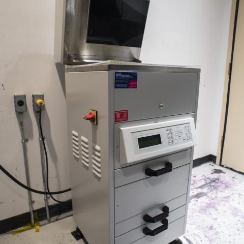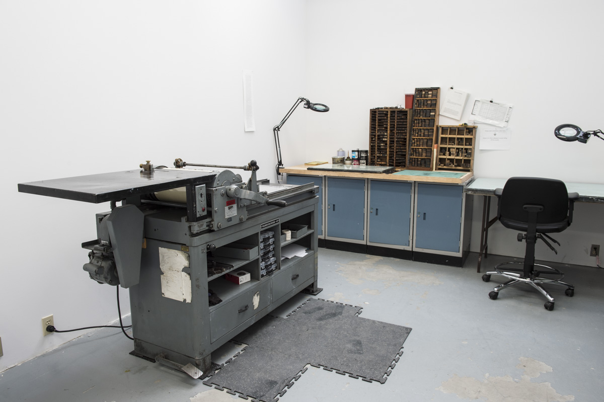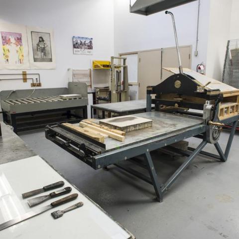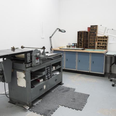 Typography houses a Vandercook 4T Proofing Press (maximum size 14x17”) to print polymer plates and offers a variety of metal type. The Heights (UK) Waterpress Platemaker is available for photopolymer platemaking up to 10x14”. Printmaking facilities provide essential equipment such as a spray-out booth, screens and squeegees, acid room with Ferric Chloride trays, aquatint rosin box (maximum 18x24” plates), paper soaking sink (maximum 36x55"), down-draft table, hot plate, rollers, and brayers.