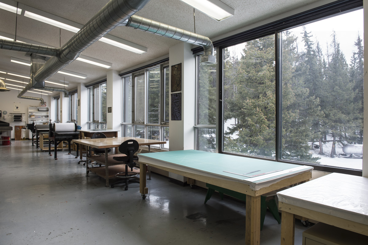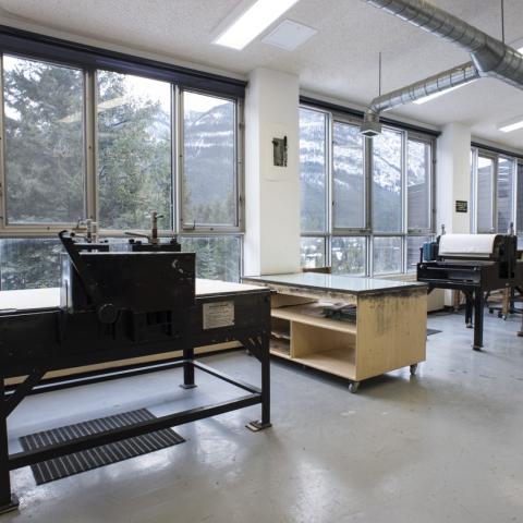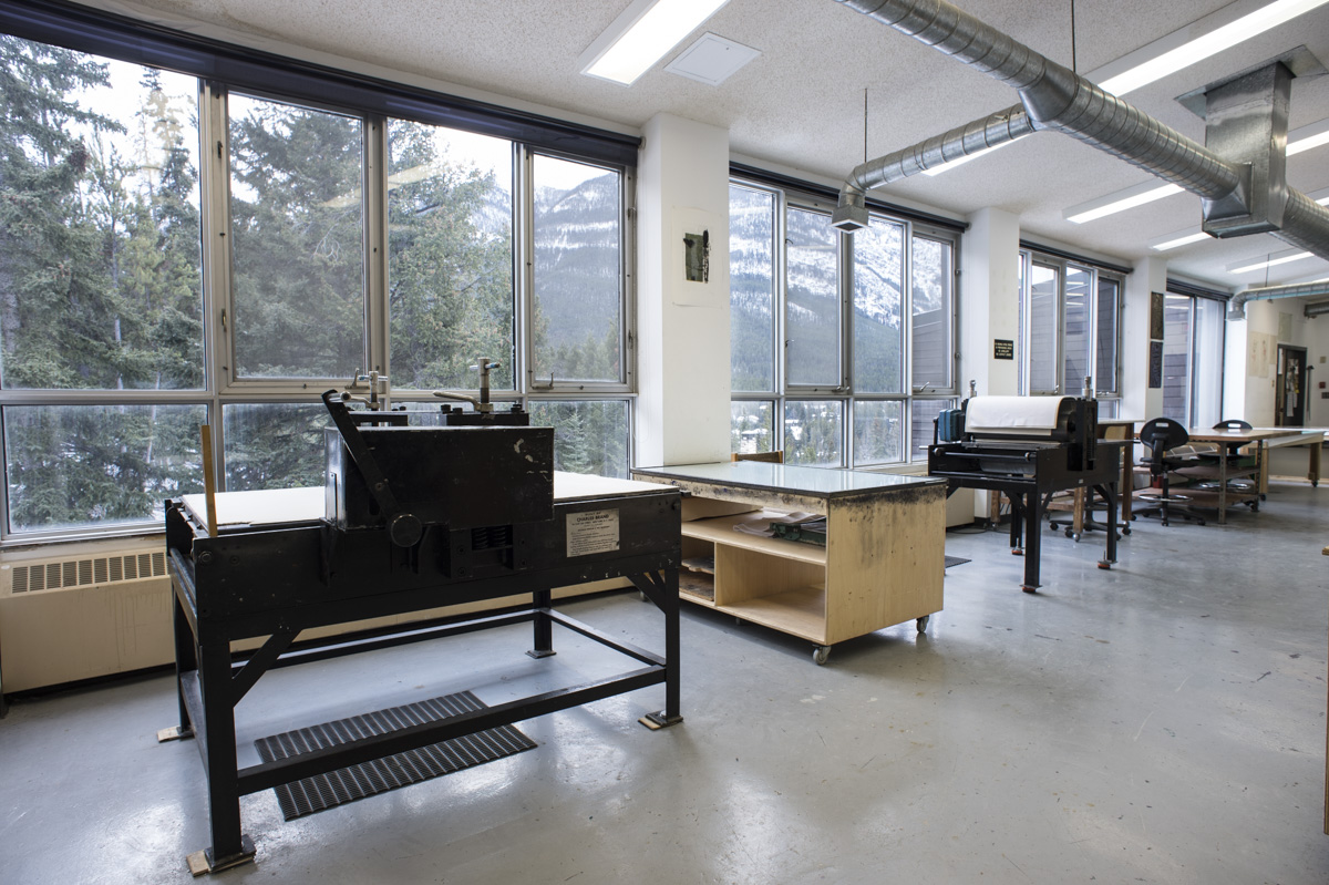 The Printmaking Studio is filled with natural light and offers a spectacular view of Rundle and Sulphur mountains. The studio is available 24 hours a day and is fully equipped for water-based screen printing, etching, and relief printing, photopolymer platemaking for letterpress, typography, and lithography. Artists can output images on clear film for photo-processes as well as produce archival full colour inkjet prints on digital fine art paper in the Digital Imaging Studio.
