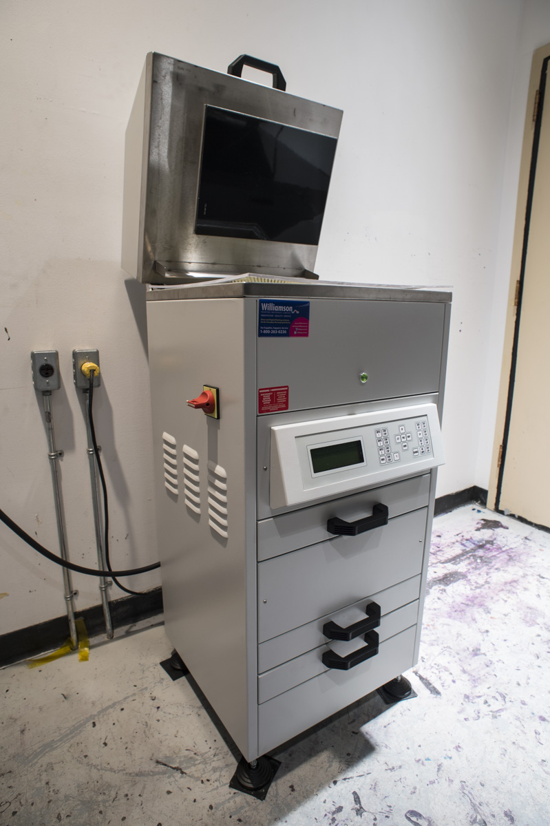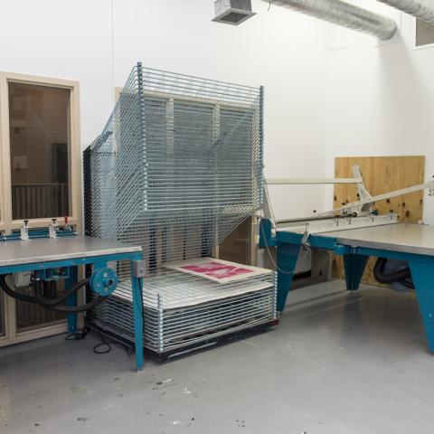 The Printmaking Studio houses two Charles Brand etching presses with bed sizes 26x48” and 36x60”. Two screen-printing vacuum tables are available; an A.W.T Seri-glide with a one-arm squeegee assembly for printing images up to 30x40”, and an A.W.T Accu-glide table for manual printing. For photo-printmaking, artists have access to a NuArc Tri-light exposure unit (max 42x52”). The Lithography Studio is a complete self-enclosed ventilated studio with a Griffin Lithography press for stone, traditional plate, and photo lithography.