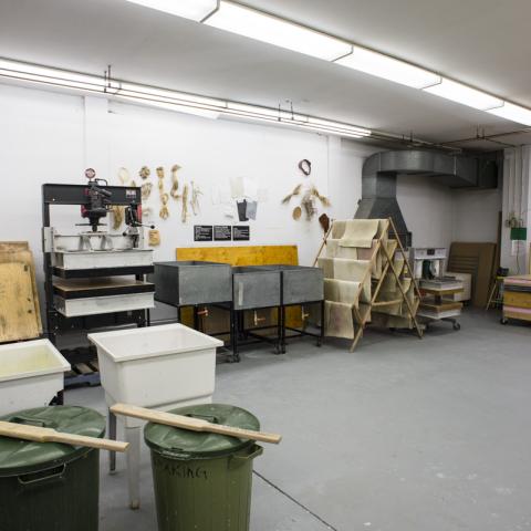 The Papermaking Studio is fully equipped for pulp and paper production and experimentation in contemporary paper art forms. Equipment includes a David Reina Hollander beater (max 1lb) and two presses to assist with sheet formation: a 25-tonne Dake hand-operated hydraulic pump with 32x42”bed, and a Howard Clark 22x30” 20-tonne press. A Lee S. McDonald Santa Ana professional paper dryer (fan operated) is used for sheet drying. Neighbouring facilities are available for mold-making and casting. Basic equipment for papermaking is provided such as a variety of molds and deckles, felts, vats, stainless steel pots, studio lift, pulp sprayer with compressed air, strainers, and refrigerator.